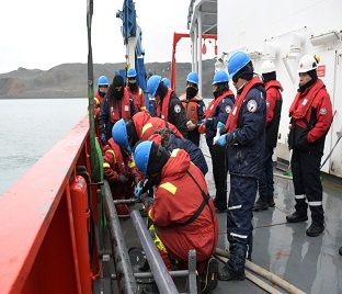 Se realizó un ejercicio de zafarrancho de abandono de buque, con la participación de oficiales, tripulación, oficiales de armadas extranjeras y científicos embarcados para la segunda fase de la campaña Antártica, con la finalidad de entrenar al personal en los procedimientos establecidos para situaciones de emergencia, verificar los tiempos de reacción y asegurar la correcta coordinación y ejecución de las medidas de seguridad correspondientes.