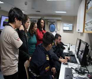 Continuando con el proyecto del INGEMMET, la unidad se dirigió a Hook Bridge, área caracterizada por su actividad volcánica. En la zona se desplegó nuevamente la roseta oceanográfica y se obtuvieron muestras de fondo; adicionalmente, se ejecutó un levantamiento con ecosonda multihaz y un perfilador de subsuelo marino, con el objetivo de caracterizar en detalle el fondo marino.