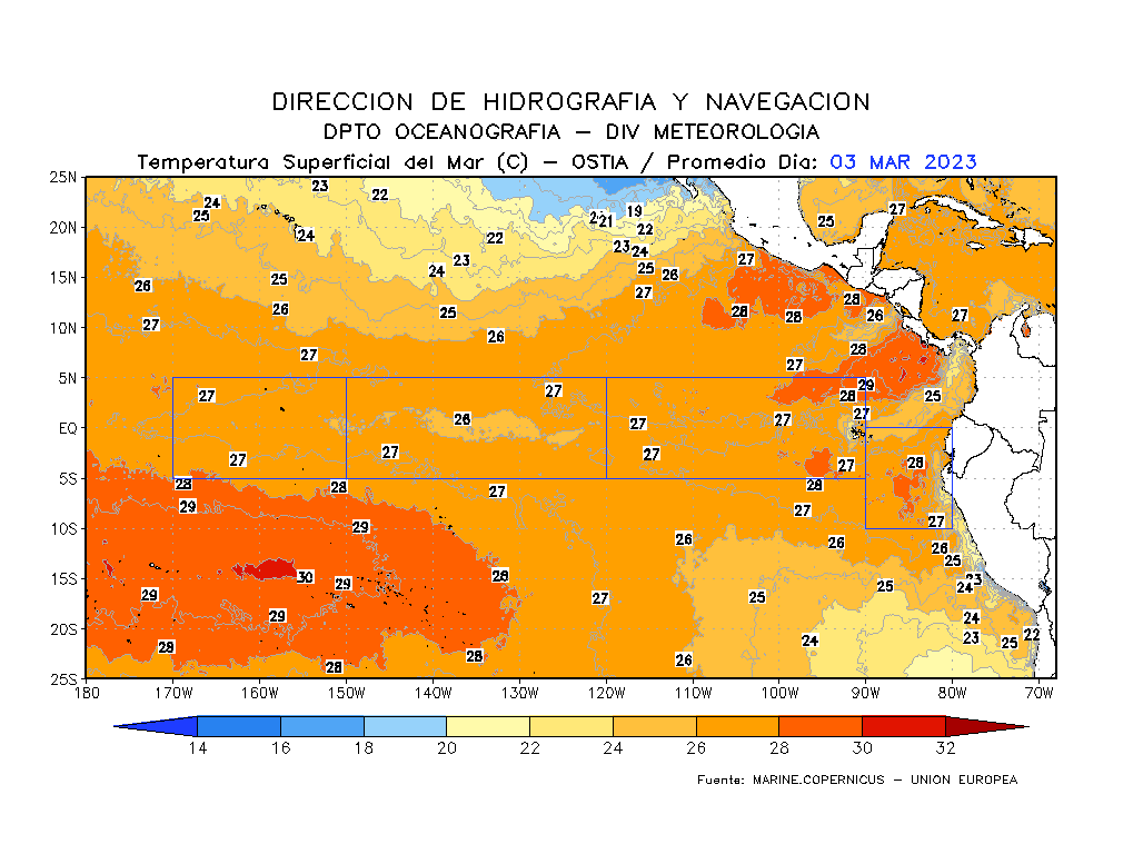 Figura 1. Temperatura superficial del mar (°C) en el océano Pacífico. Los cuadros en azul son regiones Niño. Fuente: Datos: OSTIA; Gráficos: DHN