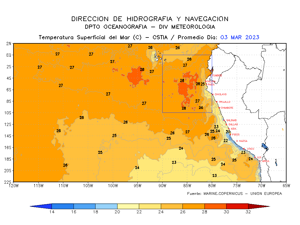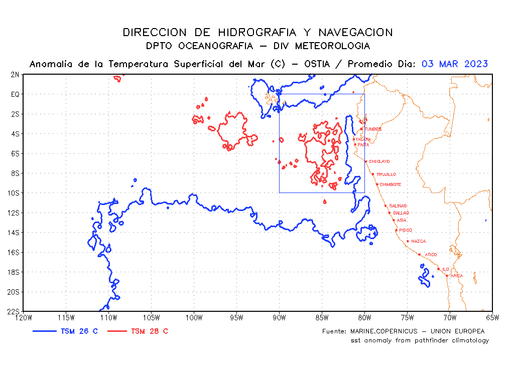 En la región adyacente a la costa sudamericana (región Niño 1+2), la temperatura muestra valores de hasta 23°C cerca de la costa de Perú y 26°C al norte de 04°S. Estos valores de temperatura muestran el desarrollo de núcleos cálidos al norte de los 8°S y la costa sudamericana, mostrando una anomalía de hasta +2.5°C; con la presencia de una condición sobre lo normal en gran parte del área, desarrollándose la isoterma hasta 28°C.
