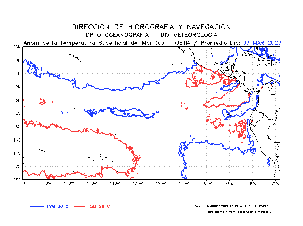 , linea azul isoterma 26°.Fuente: Datos:OSTIA; Gráficos:DHN.
