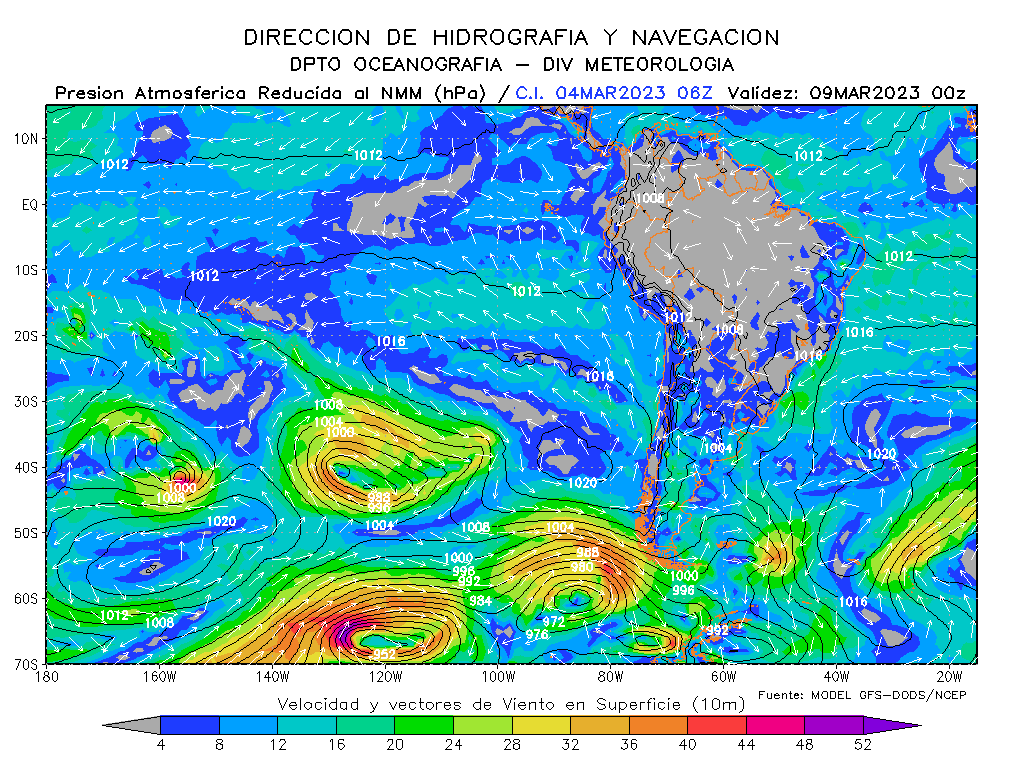 El modelo GFS-DODS/NCEP para el 05 de marzo muestra que frente a la costa de Perú los vientos del sudeste presentaría condiciones debilitadas para los próximos días. El anticiclón del Pacífico sur tendría una composición zonal con un desarrollo estacionario y con una tendencia a disminuir su intensidad, presentándose un debilitamiento de los vientos del sudeste frente a toda la costa de Perú.