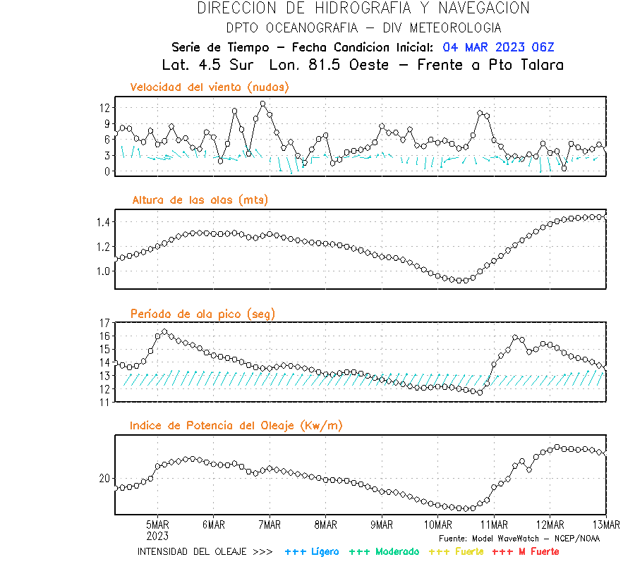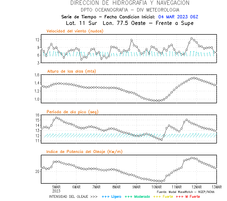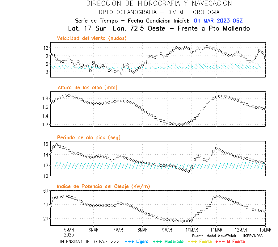 El modelo WWATCH III para el 05 de marzo muestra frente a la costa norte de Perú vientos con magnitudes de 06 a 13 nudos frente a la costa norte, en el centro de 07 a 12 nudos y frente a la costa sur (Ilo) fluctuación de 07 a 10 nudos. El mismo modelo, muestra frente a la costa del Perú un incremento de la altura de las olas de 1.1 m a 1.8 m, asociado a periodos de 13 s a 16 s.