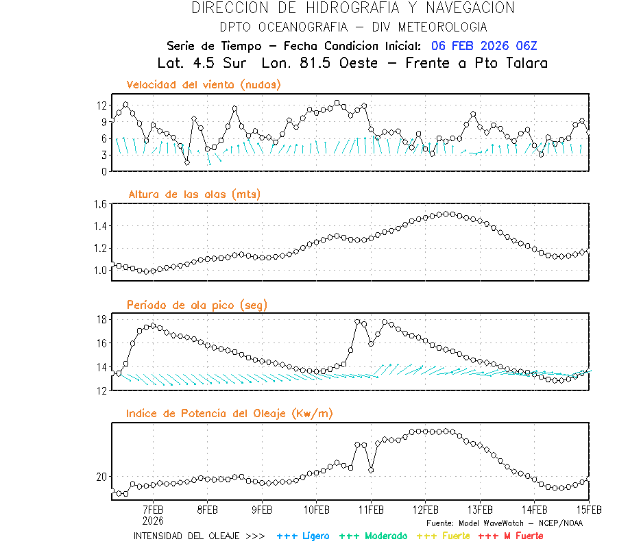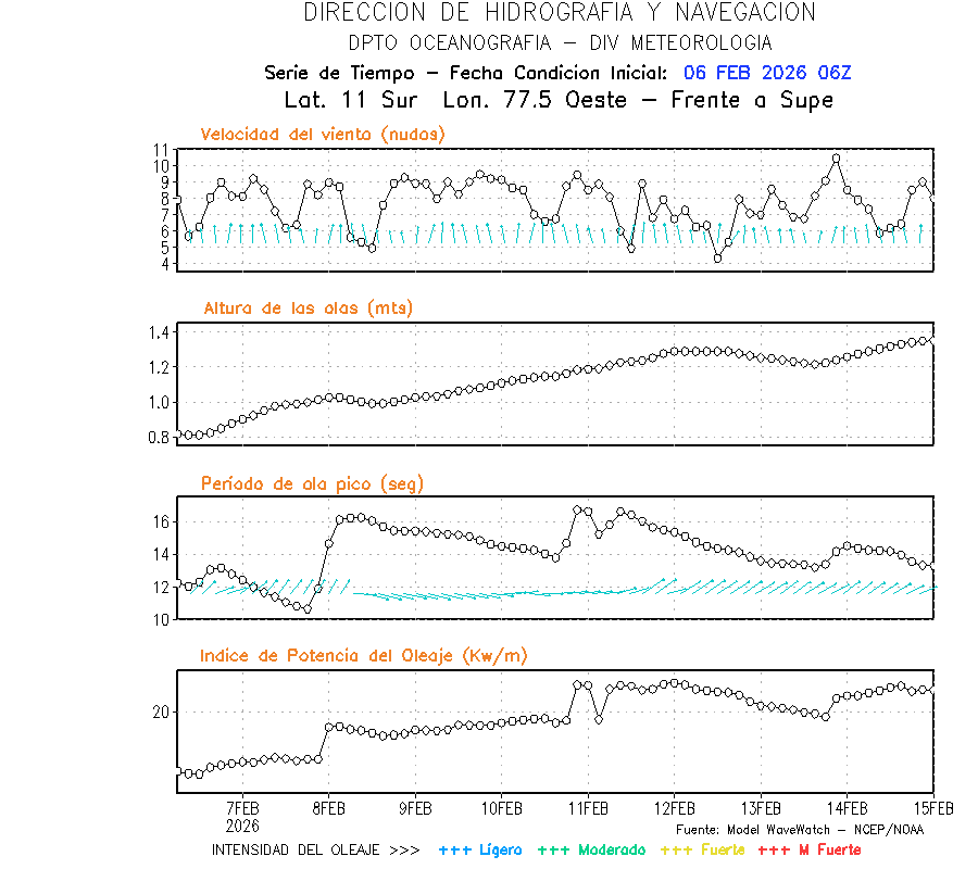 El modelo WWATCH III para el 07 de febrero muestra frente a la costa norte de Perú vientos con magnitudes de 09 a 15 nudos frente a la costa norte, en el centro de 06 a 15 nudos y frente a la costa sur fluctuación de 03 a 12 nudos. El mismo modelo, muestra frente a la costa norte y centro de Perú una tendencia al decaimiento de la altura de las olas de 1.2m a 1.1m; mientras que, una tendencia al incremento frente a la costa centro y sur que sería de 1.0m a 1.7m, asociado a periodos de 11 s a 18 s.