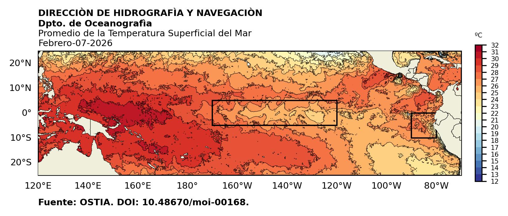 Figura 1. Temperatura superficial del mar (°C) en el océano Pacífico. Los cuadros en azul son regiones Niño. Fuente: Datos: OSTIA; Gráficos: DHN