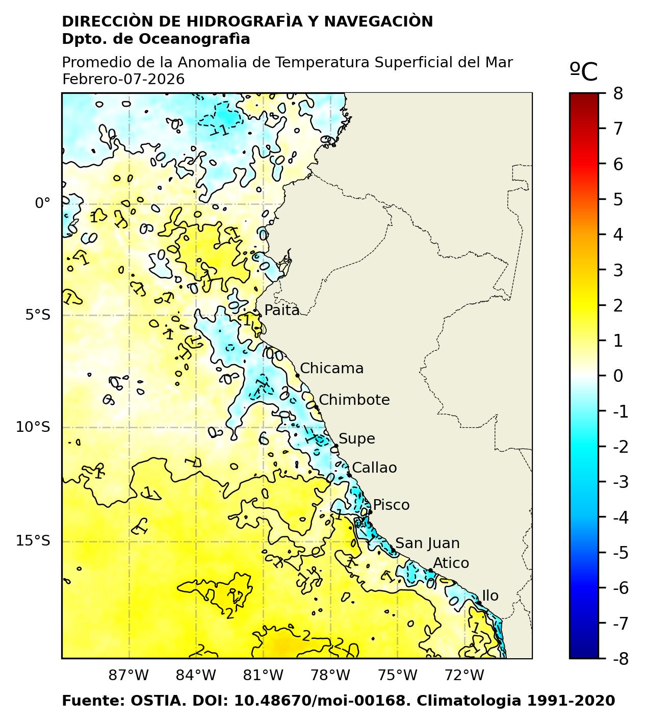 En el mar de Perú, la temperatura presentó valores entre 26 °C y 16 °C, presentando una condición por debajo de lo normal frente a la costa sur, con la presencia de núcleos de hasta -2 °C por dentro de las primeras 50 millas; mientras que, frente a la costa centro se presenta una condición más próxima a lo normal, pero con la presencia de algunos núcleos negativos. En tanto que, frente a la costa norte se desarrollaron núcleos positivos de hasta +1.5 °C con un alcance de hasta 100 millas. Por otro lado, de forma oceánica y por fuera de las 50 millas frente a la costa sur, se presentan núcleos de anomalía térmica positiva superiores a +1 °C al sur de los 12° S.