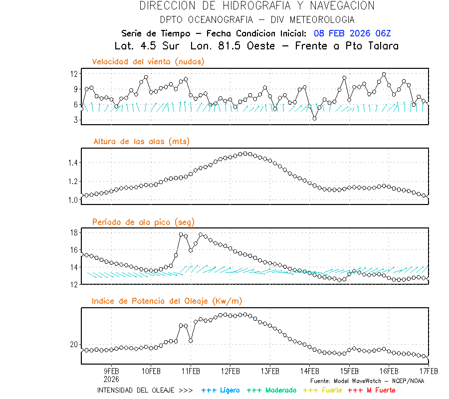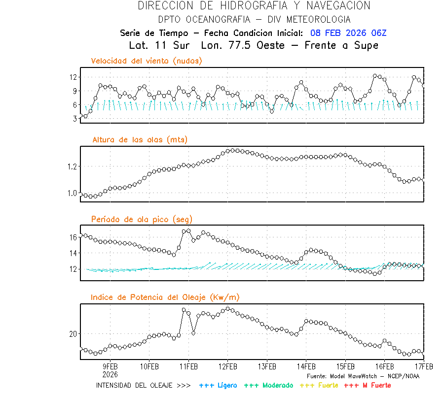 El modelo WWATCH III para el 09 de febrero muestra frente a la costa norte de Perú vientos con magnitudes de 09 a 15 nudos frente a la costa norte, en el centro de 06 a 15 nudos y frente a la costa sur fluctuación de 03 a 12 nudos. El mismo modelo, muestra frente a la costa norte y centro de Perú una tendencia al decaimiento de la altura de las olas de 1.2m a 1.1m; mientras que, una tendencia al incremento frente a la costa centro y sur que sería de 1.0m a 1.7m, asociado a periodos de 11 s a 18 s.