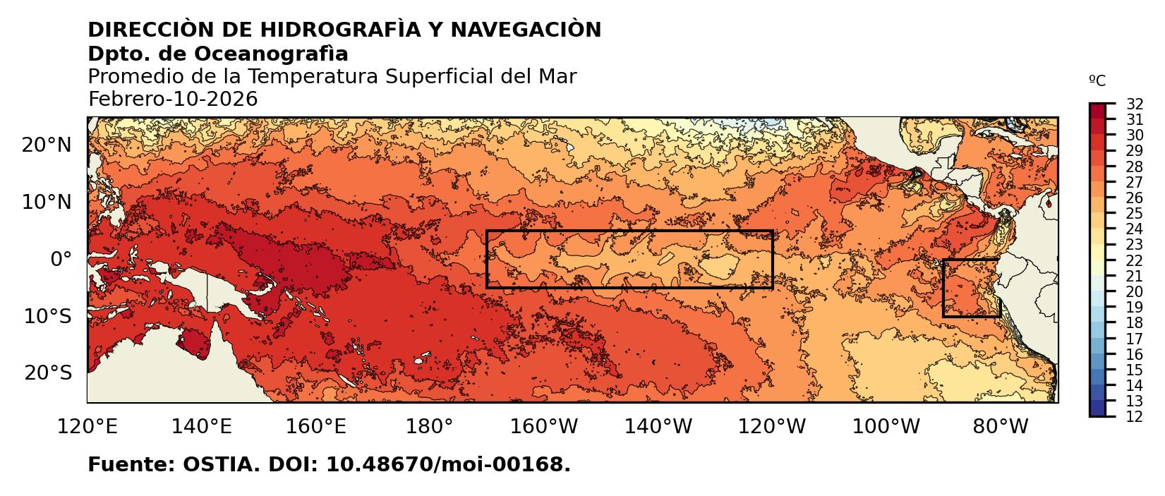 Figura 1. Temperatura superficial del mar (°C) en el océano Pacífico. Los cuadros en azul son regiones Niño. Fuente: Datos: OSTIA; Gráficos: DHN