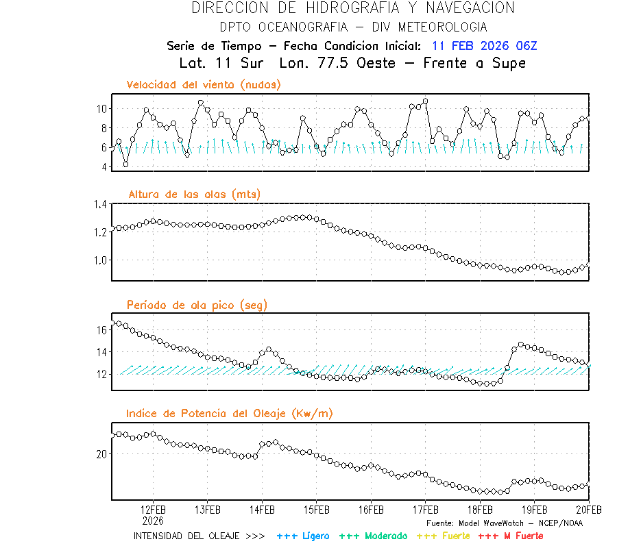 El modelo WWATCH III para el 12 de febrero muestra frente a la costa norte de Perú vientos con magnitudes de 06 a 10 nudos frente a la costa norte, en el centro de 06 a 10 nudos y frente a la costa sur fluctuación de 06 a 10 nudos. El mismo modelo, muestra frente a la costa norte y centro de Perú una tendencia al incremento de la altura de las olas de 1.0m a 1.2m; mientras que, frente a la costa sur sería de 1.2m a 1.3m, asociado a periodos de 11 s a 20 s.
