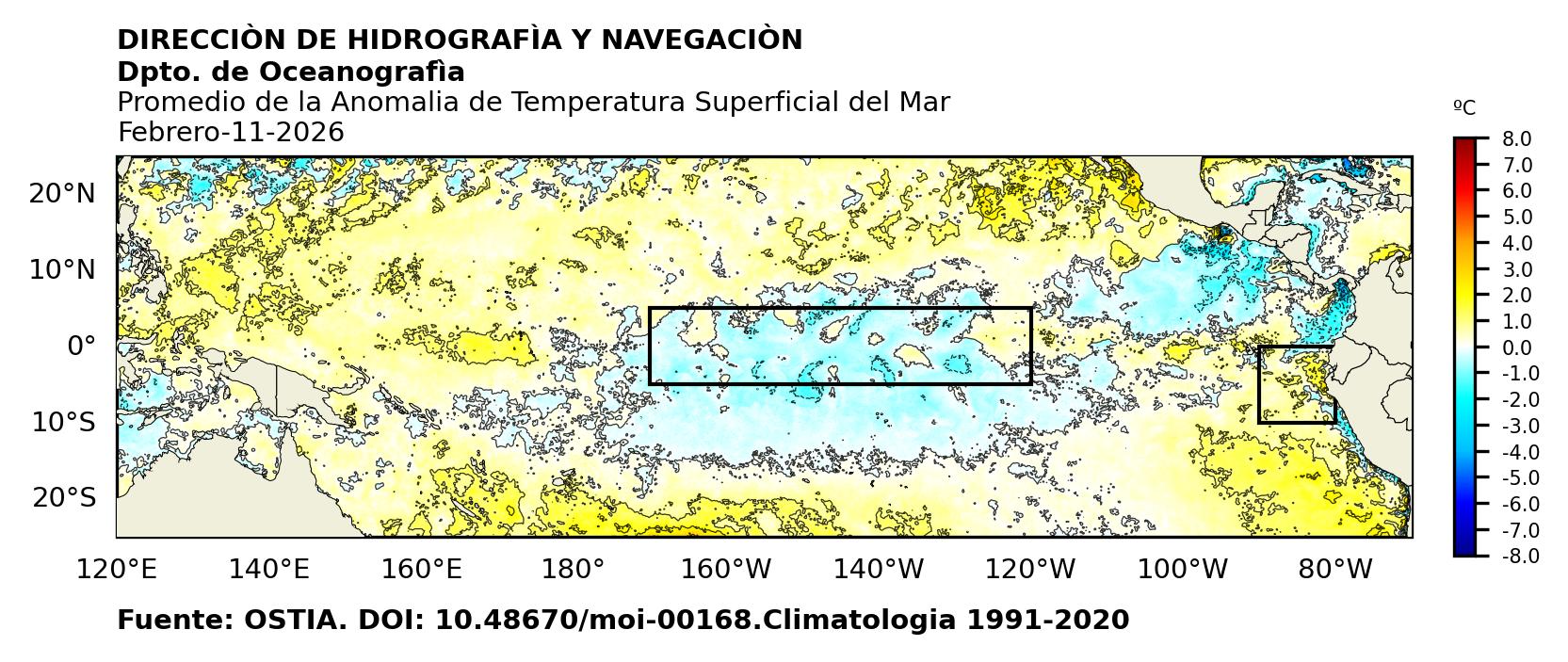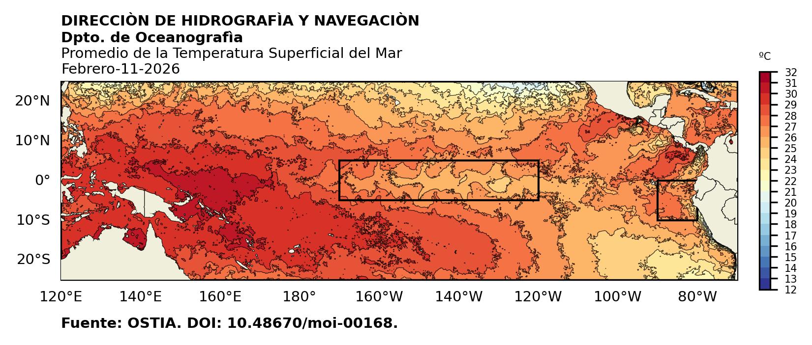 Figura 1. Temperatura superficial del mar (°C) en el océano Pacífico. Los cuadros en azul son regiones Niño. Fuente: Datos: OSTIA; Gráficos: DHN