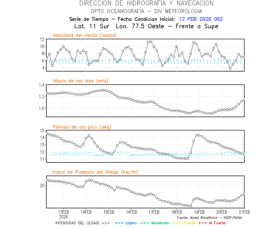 El modelo WWATCH III para el 13 de febrero muestra frente a la costa norte de Perú vientos con magnitudes de 06 a 10 nudos frente a la costa norte, en el centro de 06 a 10 nudos y frente a la costa sur fluctuación de 06 a 10 nudos. El mismo modelo, muestra frente a la costa norte y centro de Perú una tendencia al incremento de la altura de las olas de 1.0m a 1.2m; mientras que, frente a la costa sur sería de 1.2m a 1.3m, asociado a periodos de 11 s a 20 s.