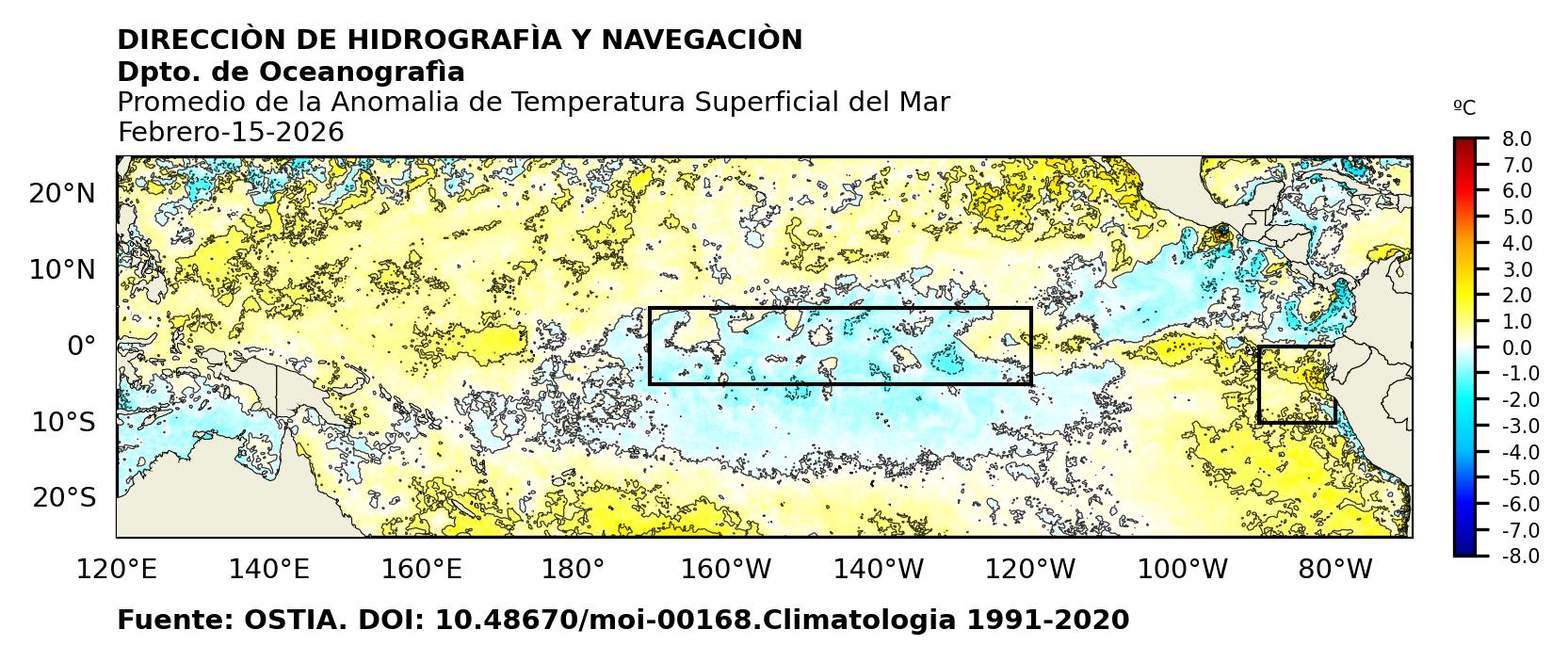 Figura 1. Temperatura superficial del mar (°C) en el océano Pacífico. Los cuadros en azul son regiones Niño. Fuente: Datos: OSTIA; Gráficos: DHN