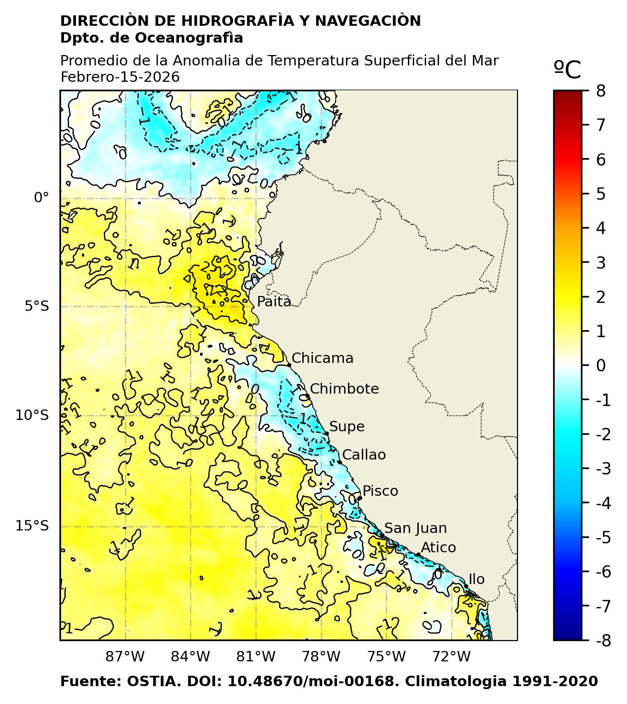 En la serie temporal de temperatura, se observó una condición fluctuante entre fría-normal y cálida-normal frente a la costa de centro-sur y norte de Perú, respectivamente. Desde diciembre 2025 se viene desarrollando una condición diferenciada entre la costa norte de Perú y la costa centro-sur, desarrollándo núcleos positivos intensos cerca de costa que han sobrepasado los +2 °C, aunque a nivel de la región Niño 1+2 el incremento se viene sucitando de forma más paulatina, estando todavía con una condición dentro del rango normal para mediados de febrero 2026, a pesar de haber pasado a un valor anómalo promedio positivo. Por el contrario, en la zona centro-sur se mantienen intensos núcleos de anomalía negativa; mientras que, en la región central a partir de febrero se viene presentando un declive de estas anomalías negativas a valores dentro de lo normal, todavía presentando algunos núcleos de -1 °C. Asimismo, en la región Central también se viene desarrollando una normalización de los núcleos negativos que venian predominando, durante los últimos meses.