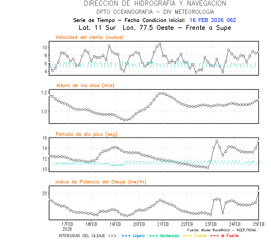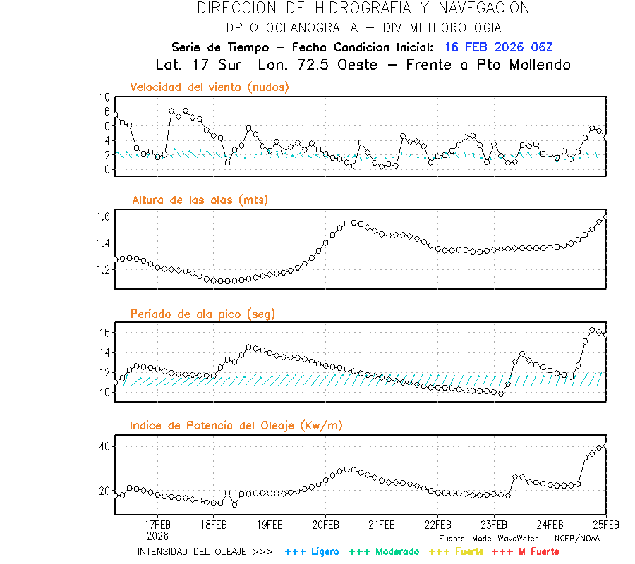 El modelo WWATCH III para el 17 de febrero muestra frente a la costa norte de Perú vientos con magnitudes de 03 a 13 nudos frente a la costa norte, en el centro de 04 a 10 nudos y frente a la costa sur fluctuación de 01 a 08 nudos. El mismo modelo, muestra frente a la costa norte y centro de Perú una tendencia al decremento de la altura de las olas de 1.1 m a 0.9 m; mientras que, frente a la costa sur sería de 1.3 m a 1.1 m, asociado a periodos de 11 s a 14 s.