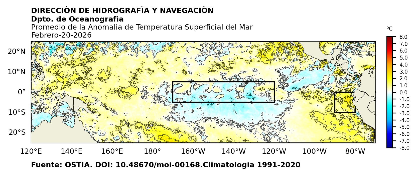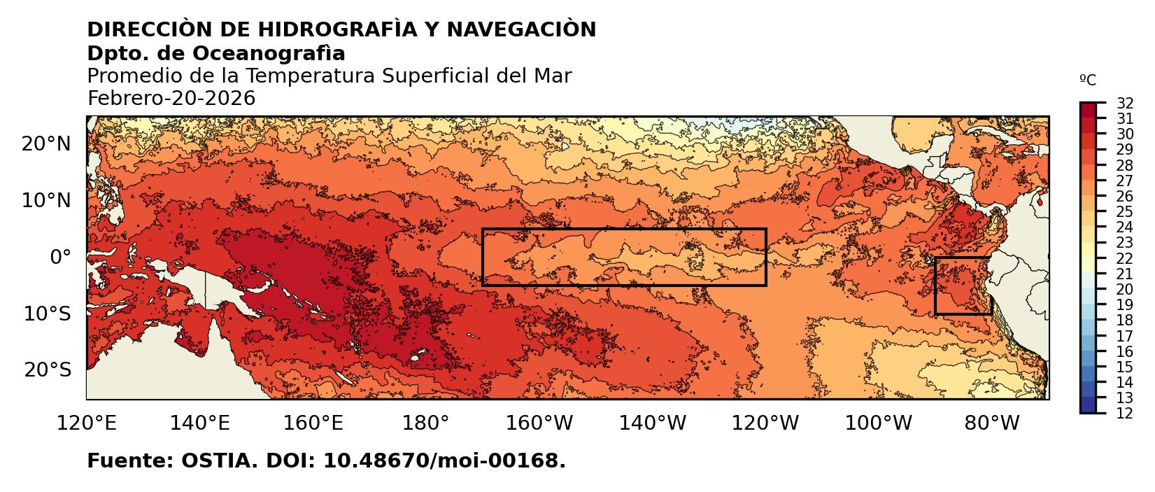 Figura 1. Temperatura superficial del mar (°C) en el océano Pacífico. Los cuadros en azul son regiones Niño. Fuente: Datos: OSTIA; Gráficos: DHN
