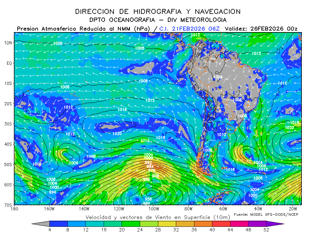 Para el 22 de febrero el sistema de alta presión disminuiría a dentro del rango normal con presiones máximas de 1024 hPa y ubicándose al oeste de su posición normal; debido a esto, los vientos del sudeste se presentarían con intensidad de por debajo de lo normal frente a toda la costa de Perú.