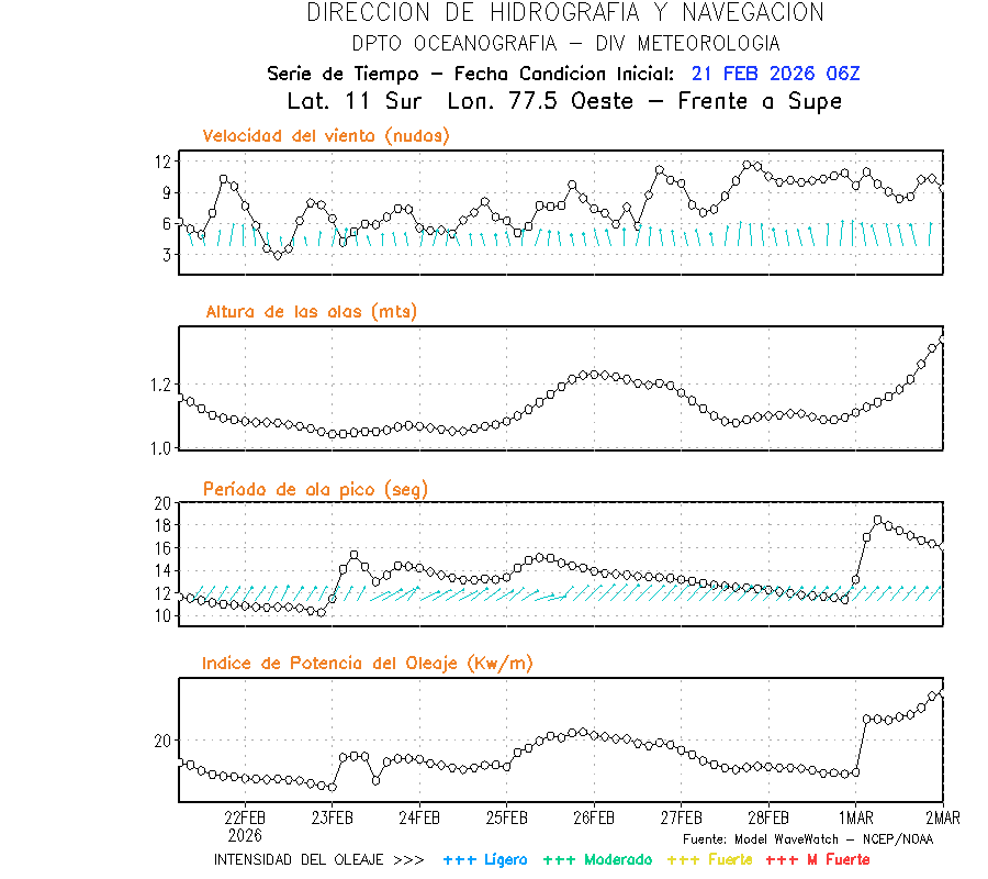 El modelo WWATCH III para el 22 de febrero muestra frente a la costa norte de Perú vientos con magnitudes de 03 a 13 nudos frente a la costa norte, en el centro de 04 a 10 nudos y frente a la costa sur fluctuación de 01 a 08 nudos. El mismo modelo, muestra frente a la costa norte y centro de Perú una tendencia al decremento de la altura de las olas de 1.1 m a 0.9 m; mientras que, frente a la costa sur sería de 1.3 m a 1.1 m, asociado a periodos de 11 s a 14 s.