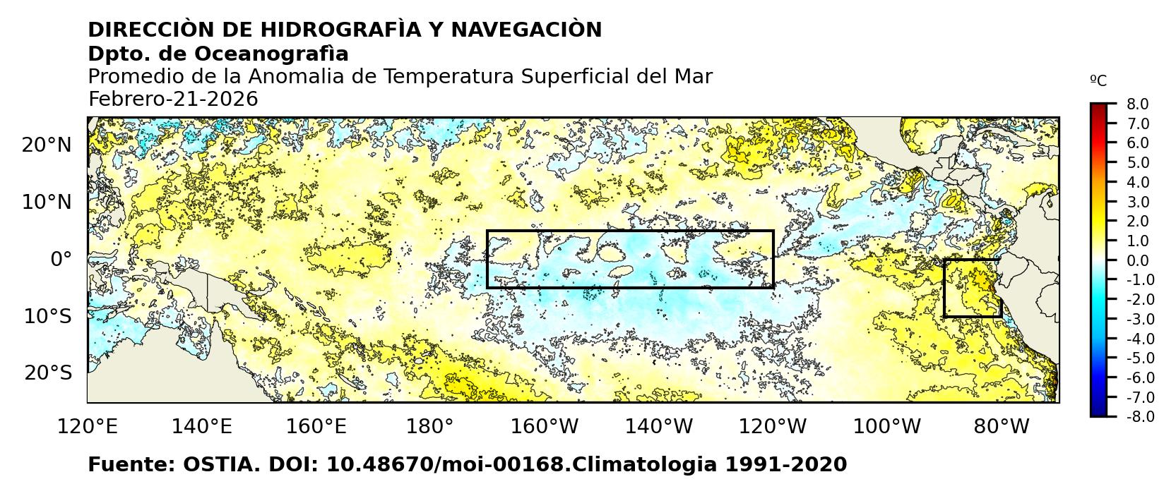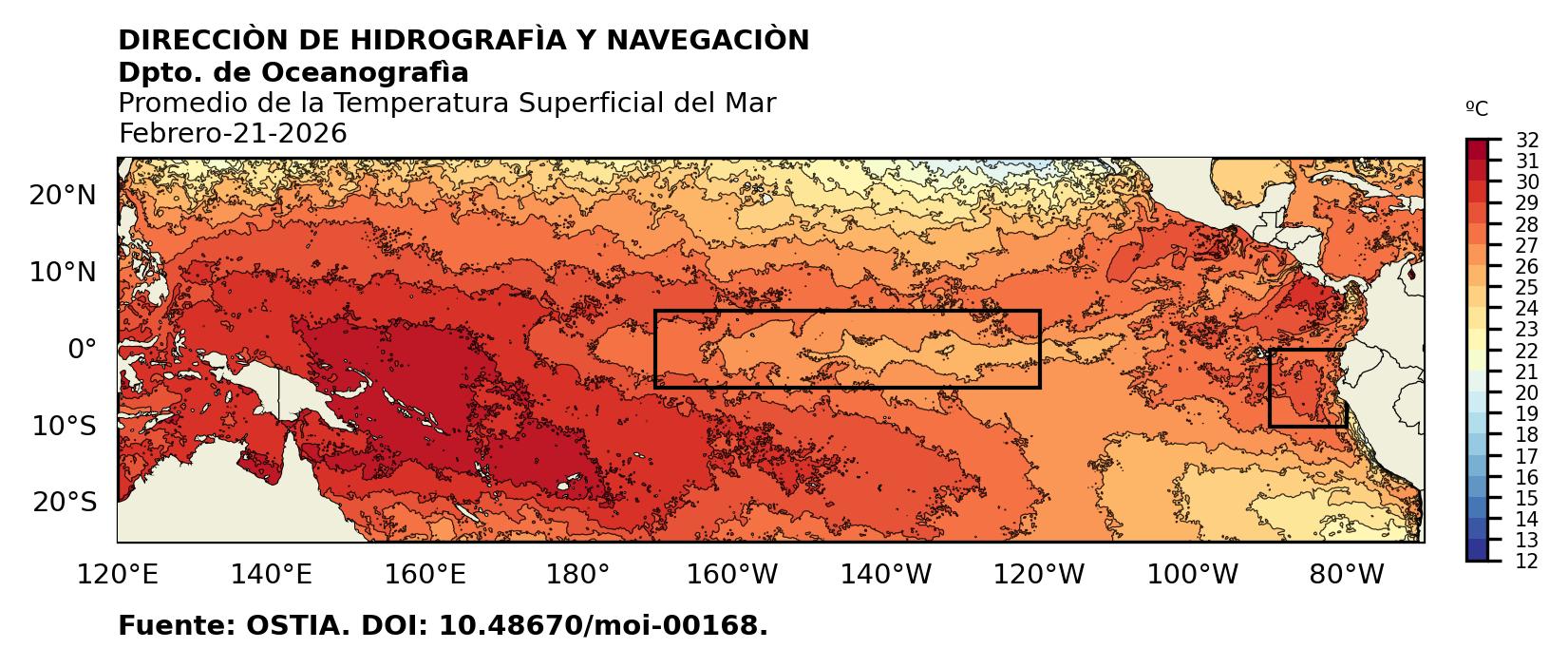 Figura 1. Temperatura superficial del mar (°C) en el océano Pacífico. Los cuadros en azul son regiones Niño. Fuente: Datos: OSTIA; Gráficos: DHN