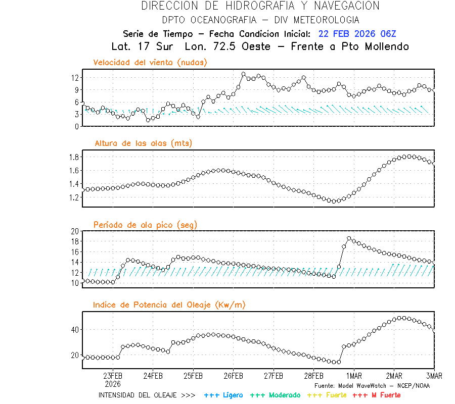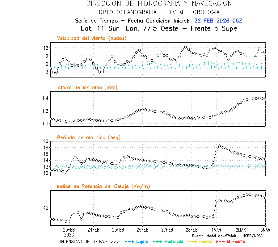 El modelo WWATCH III para el 23 de febrero muestra frente a la costa norte de Perú vientos con magnitudes de 03 a 13 nudos frente a la costa norte, en el centro de 04 a 10 nudos y frente a la costa sur fluctuación de 01 a 08 nudos. El mismo modelo, muestra frente a la costa norte y centro de Perú una tendencia al decremento de la altura de las olas de 1.1 m a 0.9 m; mientras que, frente a la costa sur sería de 1.3 m a 1.1 m, asociado a periodos de 11 s a 14 s.