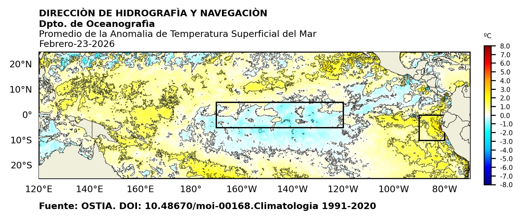Figura 1. Temperatura superficial del mar (°C) en el océano Pacífico. Los cuadros en azul son regiones Niño. Fuente: Datos: OSTIA; Gráficos: DHN