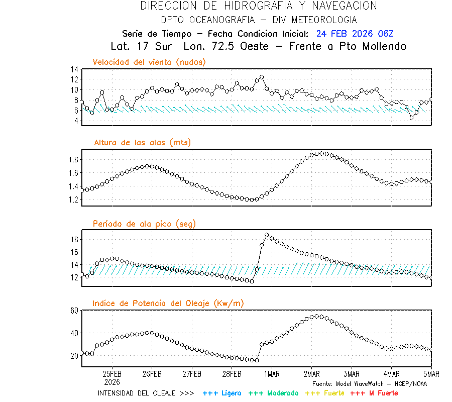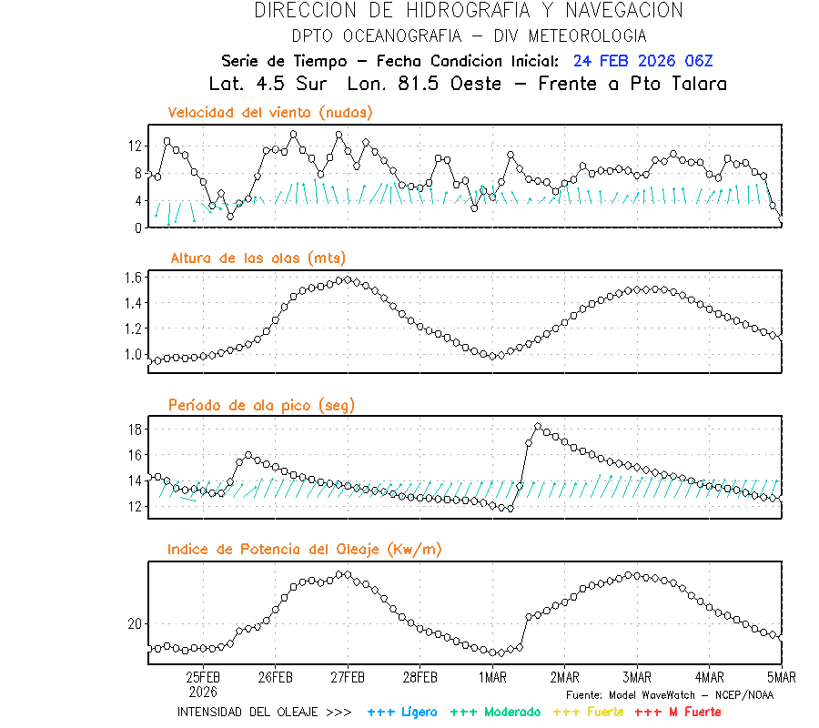 El modelo WWATCH III para el 25 de febrero muestra frente a la costa norte de Perú vientos con magnitudes de 04 a 16 nudos frente a la costa norte, en el centro de 03 a 09 nudos y frente a la costa sur fluctuación de 04 a 06 nudos. El mismo modelo, muestra frente a la costa norte y centro de Perú una tendencia al incremento de la altura de las olas de 0.9 m a 1.2 m; mientras que, frente a la costa sur sería de 1.3 m a 1.6 m, asociado a periodos de 12 s a 16 s.