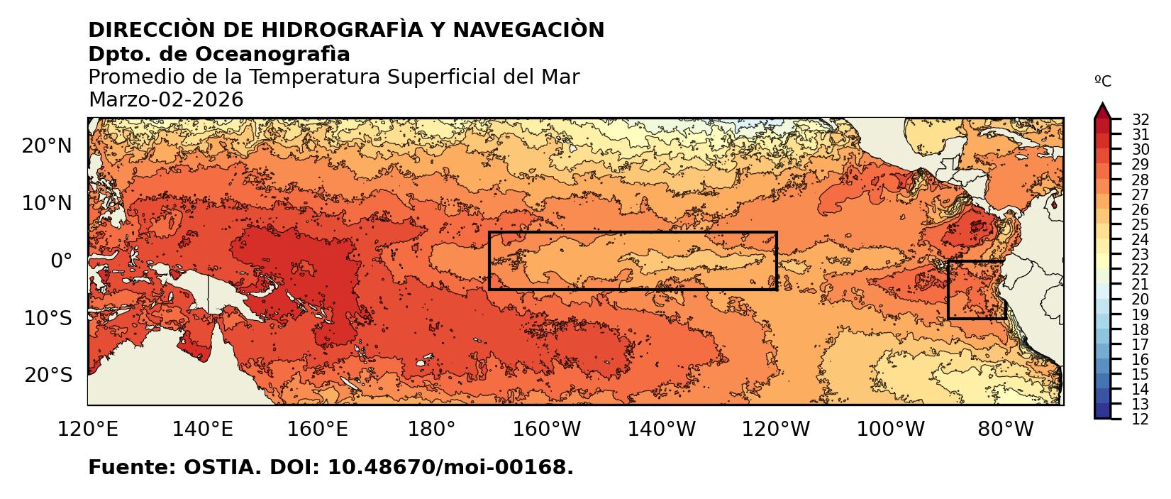 Figura 1. Temperatura superficial del mar (°C) en el océano Pacífico. Los cuadros en azul son regiones Niño. Fuente: Datos: OSTIA; Gráficos: DHN