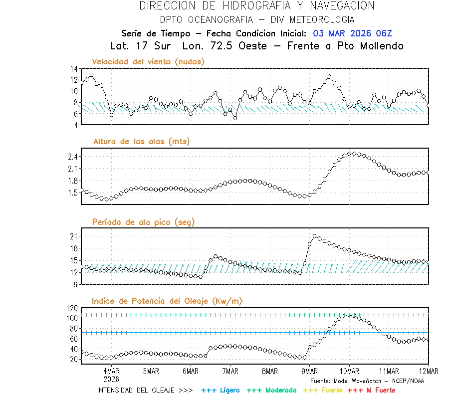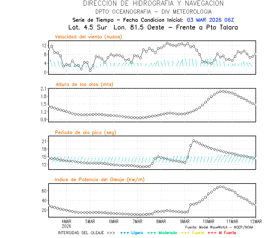 El modelo WWATCH III para el 04 de marzo muestra frente a la costa norte de Perú vientos con magnitudes de 04 a 16 nudos frente a la costa norte, en el centro de 03 a 09 nudos y frente a la costa sur fluctuación de 04 a 06 nudos. El mismo modelo, muestra frente a la costa norte y centro de Perú una tendencia al incremento de la altura de las olas de 0.9 m a 1.2 m; mientras que, frente a la costa sur sería de 1.3 m a 1.6 m, asociado a periodos de 12 s a 16 s.
