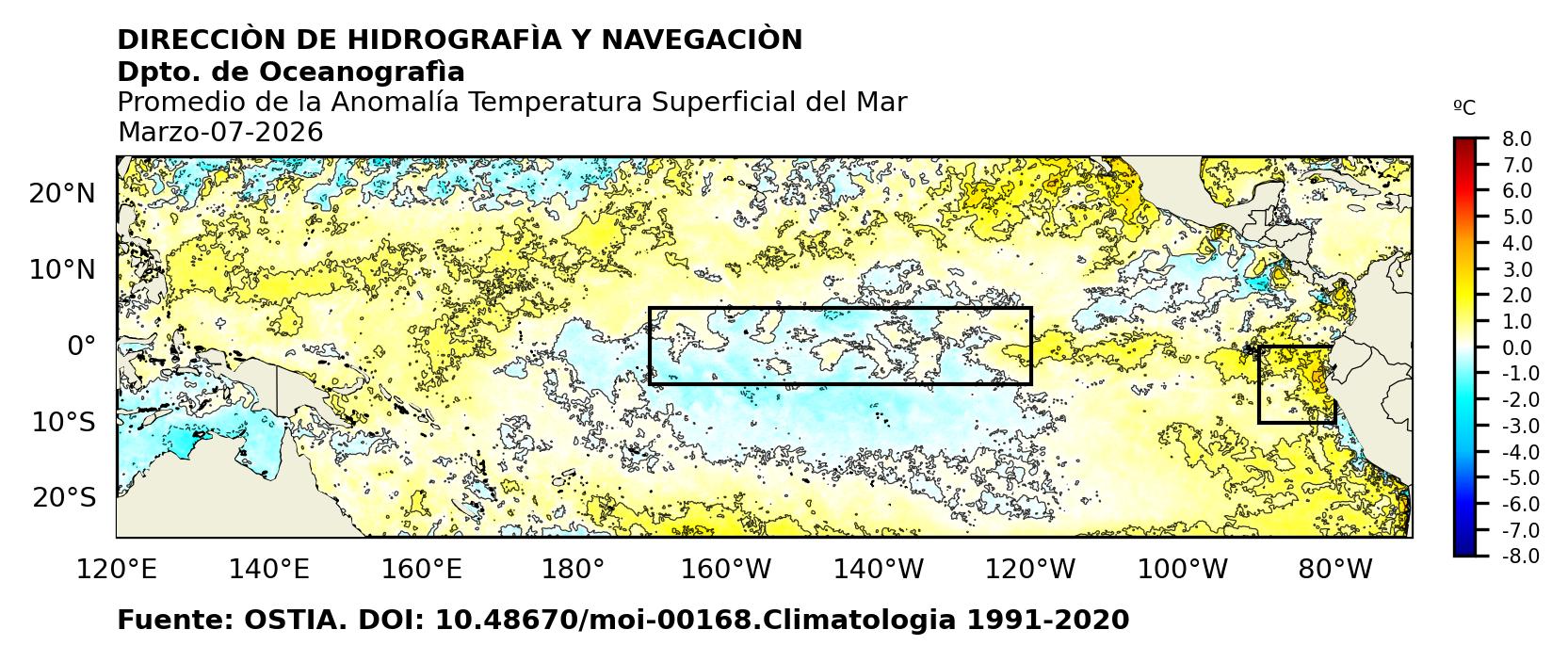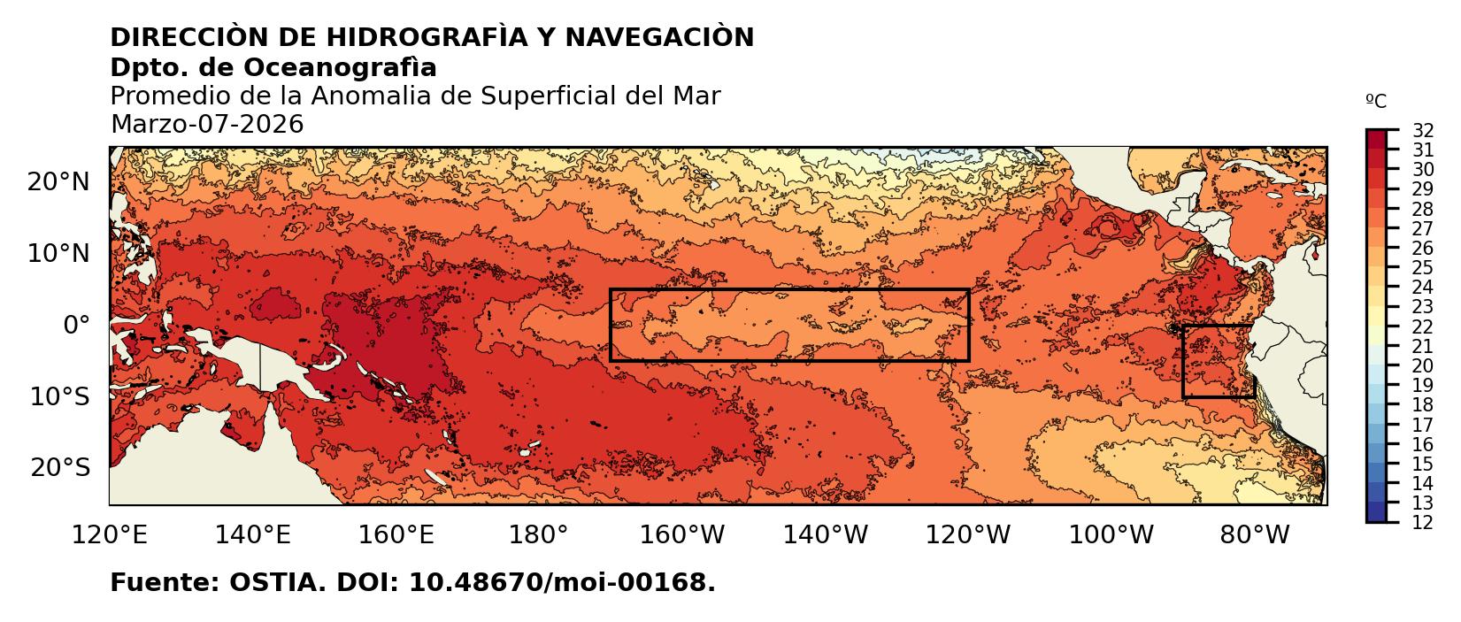Figura 1. Temperatura superficial del mar (°C) en el océano Pacífico. Los cuadros en azul son regiones Niño. Fuente: Datos: OSTIA; Gráficos: DHN