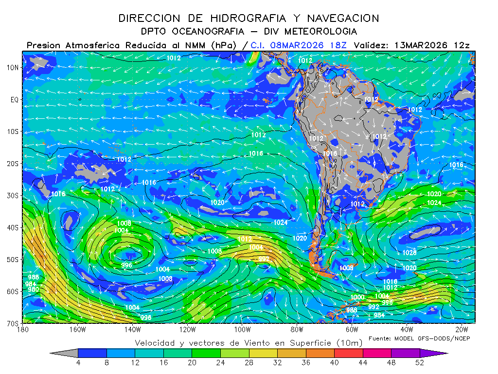 Para el 09 de marzo el sistema de alta presión disminuiría dentro del rango normal con presiones máximas de 1020 hPa y ubicándose al oeste de su posición normal; debido a esto, los vientos del sudeste se presentarían con intensidad de por debajo de lo normal frente a toda la costa de Perú.