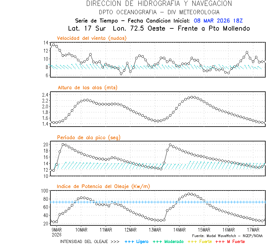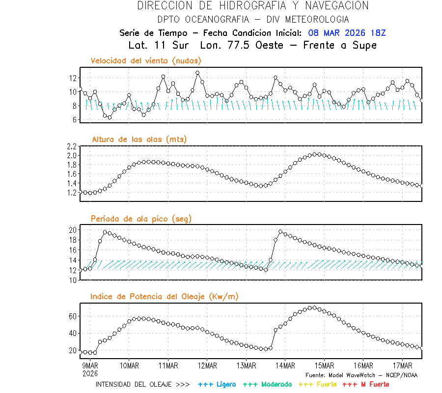 El modelo WWATCH III para el 09 de marzo muestra frente a la costa norte de Perú vientos con magnitudes de 04 a 16 nudos frente a la costa norte, en el centro de 03 a 09 nudos y frente a la costa sur fluctuación de 04 a 06 nudos. El mismo modelo, muestra frente a la costa norte y centro de Perú una tendencia al incremento de la altura de las olas de 0.9 m a 1.2 m; mientras que, frente a la costa sur sería de 1.3 m a 1.6 m, asociado a periodos de 12 s a 16 s.