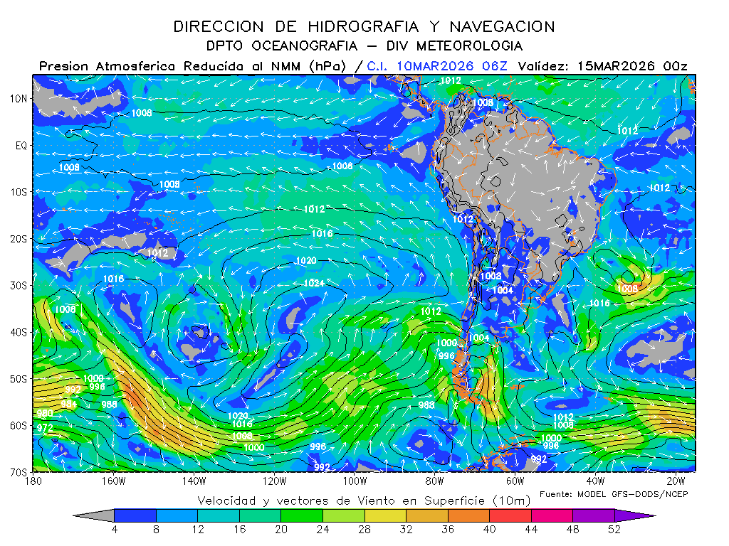 El modelo GFS-DODS/NCEP muestra que los vientos del sureste disminuirían la intensidad de su magnitud frente a la costa sur para los próximos días, se mantendrían frente a la costa norte e incrementaría frente a la centro, presentándose por debajo de lo normal frente a la costa centro de Perú y por debajo de lo normal frente a la norte y sur. El anticiclón del Pacífico sur tendría una composición zonal con un desarrollo con dirección noreste y manteniendo su intensidad, esperándose dentro de su normal y en posición ligeramente al oeste de su normal.