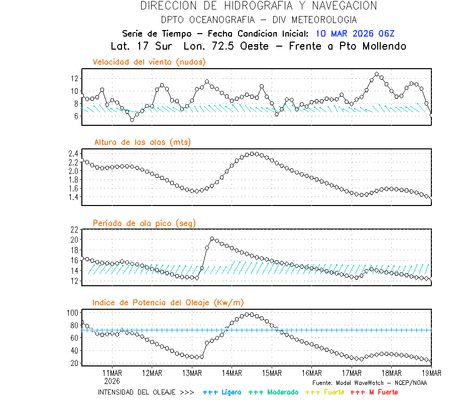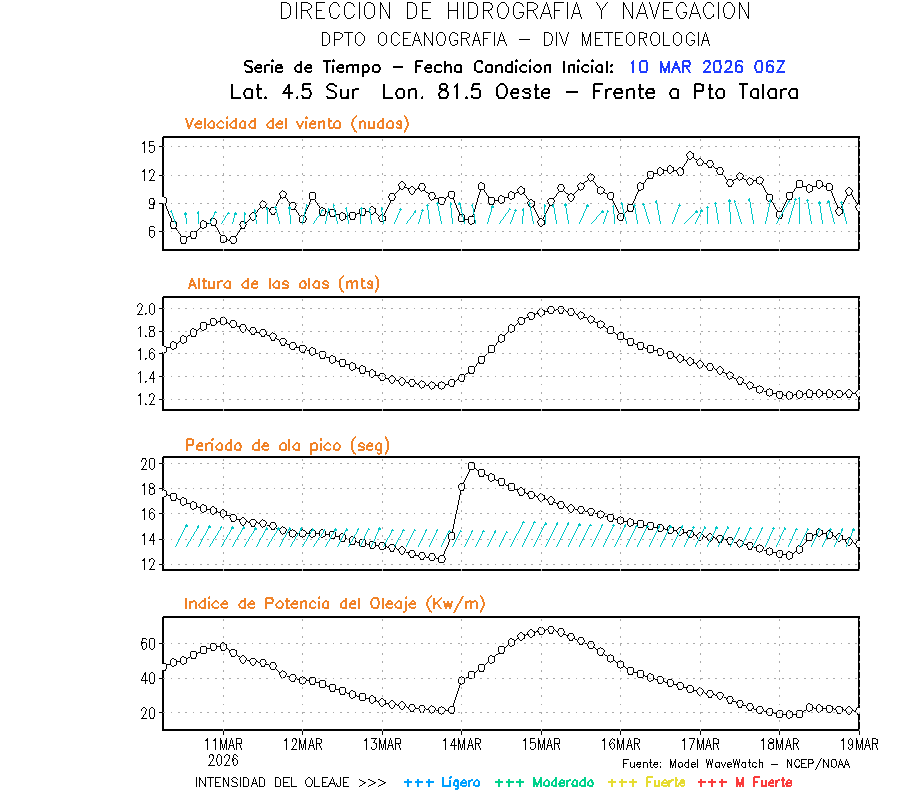 El modelo WWATCH III para el 11 de marzo muestra frente a la costa norte de Perú vientos con magnitudes de 04 a 16 nudos frente a la costa norte, en el centro de 03 a 09 nudos y frente a la costa sur fluctuación de 04 a 06 nudos. El mismo modelo, muestra frente a la costa norte y centro de Perú una tendencia al incremento de la altura de las olas de 0.9 m a 1.2 m; mientras que, frente a la costa sur sería de 1.3 m a 1.6 m, asociado a periodos de 12 s a 16 s.