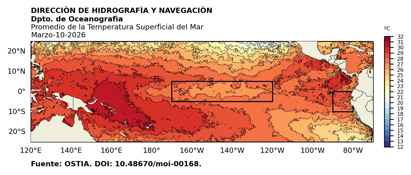 Figura 1. Temperatura superficial del mar (°C) en el océano Pacífico. Los cuadros en azul son regiones Niño. Fuente: Datos: OSTIA; Gráficos: DHN