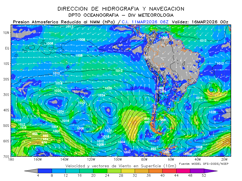 El modelo GFS-DODS/NCEP muestra que los vientos del sureste disminuirían la intensidad de su magnitud frente a la costa sur para los próximos días, se mantendrían frente a la costa norte e incrementaría frente a la centro, presentándose por debajo de lo normal frente a la costa centro de Perú y por debajo de lo normal frente a la norte y sur. El anticiclón del Pacífico sur tendría una composición zonal con un desarrollo con dirección noreste y manteniendo su intensidad, esperándose dentro de su normal y en posición ligeramente al oeste de su normal.