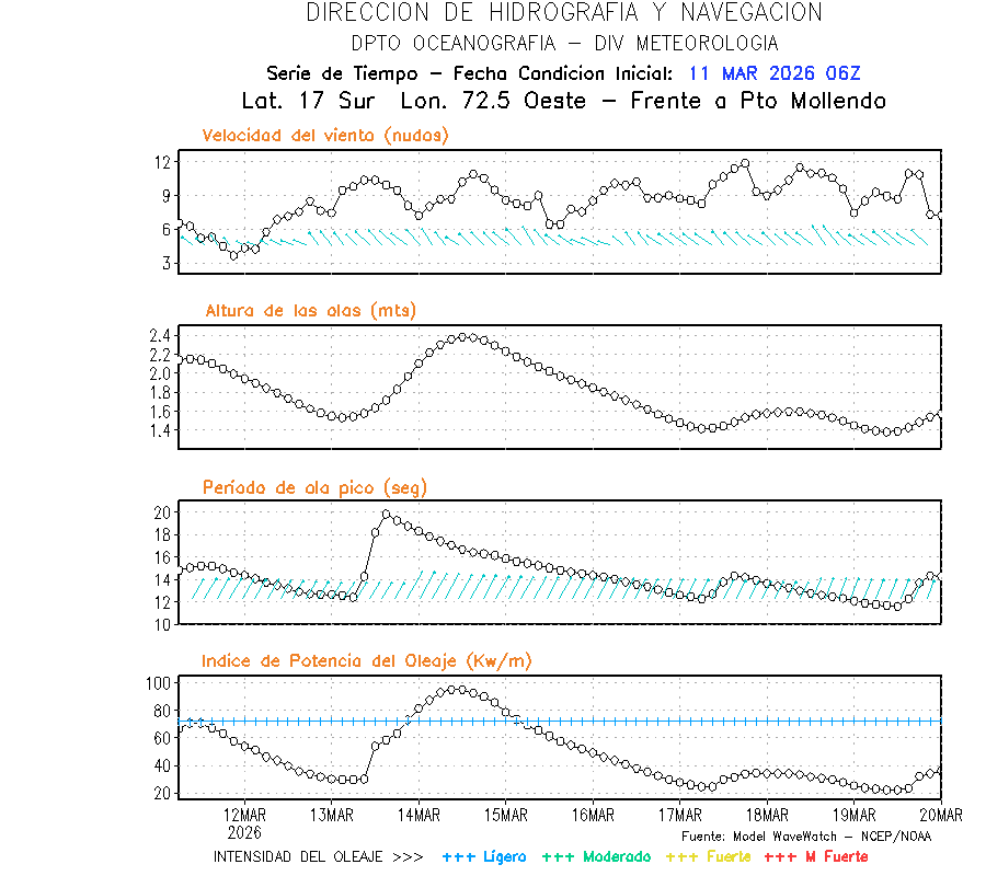 El modelo WWATCH III para el 12 de marzo muestra frente a la costa norte de Perú vientos con magnitudes de 04 a 16 nudos frente a la costa norte, en el centro de 03 a 09 nudos y frente a la costa sur fluctuación de 04 a 06 nudos. El mismo modelo, muestra frente a la costa norte y centro de Perú una tendencia al incremento de la altura de las olas de 0.9 m a 1.2 m; mientras que, frente a la costa sur sería de 1.3 m a 1.6 m, asociado a periodos de 12 s a 16 s.