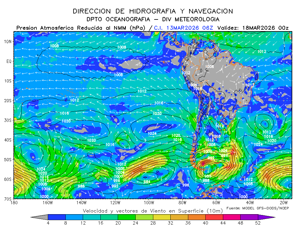El modelo GFS-DODS/NCEP muestra que los vientos del sureste disminuirían la intensidad de su magnitud frente a la costa sur para los próximos días, se mantendrían frente a la costa norte e incrementaría frente a la centro, presentándose por debajo de lo normal frente a la costa centro de Perú y por debajo de lo normal frente a la norte y sur. El anticiclón del Pacífico sur tendría una composición zonal con un desarrollo con dirección noreste y manteniendo su intensidad, esperándose dentro de su normal y en posición ligeramente al oeste de su normal.