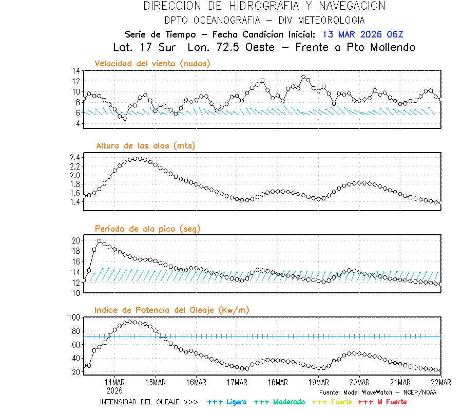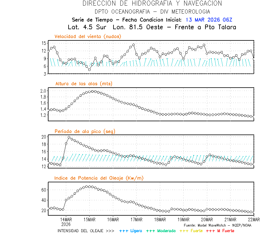 El modelo WWATCH III para el 14 de marzo muestra frente a la costa norte de Perú vientos con magnitudes de 04 a 16 nudos frente a la costa norte, en el centro de 03 a 09 nudos y frente a la costa sur fluctuación de 04 a 06 nudos. El mismo modelo, muestra frente a la costa norte y centro de Perú una tendencia al incremento de la altura de las olas de 0.9 m a 1.2 m; mientras que, frente a la costa sur sería de 1.3 m a 1.6 m, asociado a periodos de 12 s a 16 s.