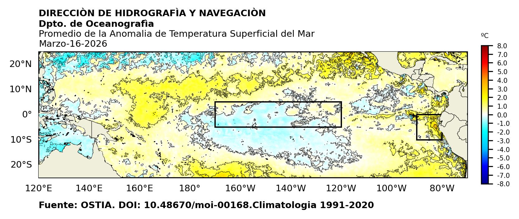 Figura 1. Temperatura superficial del mar (°C) en el océano Pacífico. Los cuadros en azul son regiones Niño. Fuente: Datos: OSTIA; Gráficos: DHN