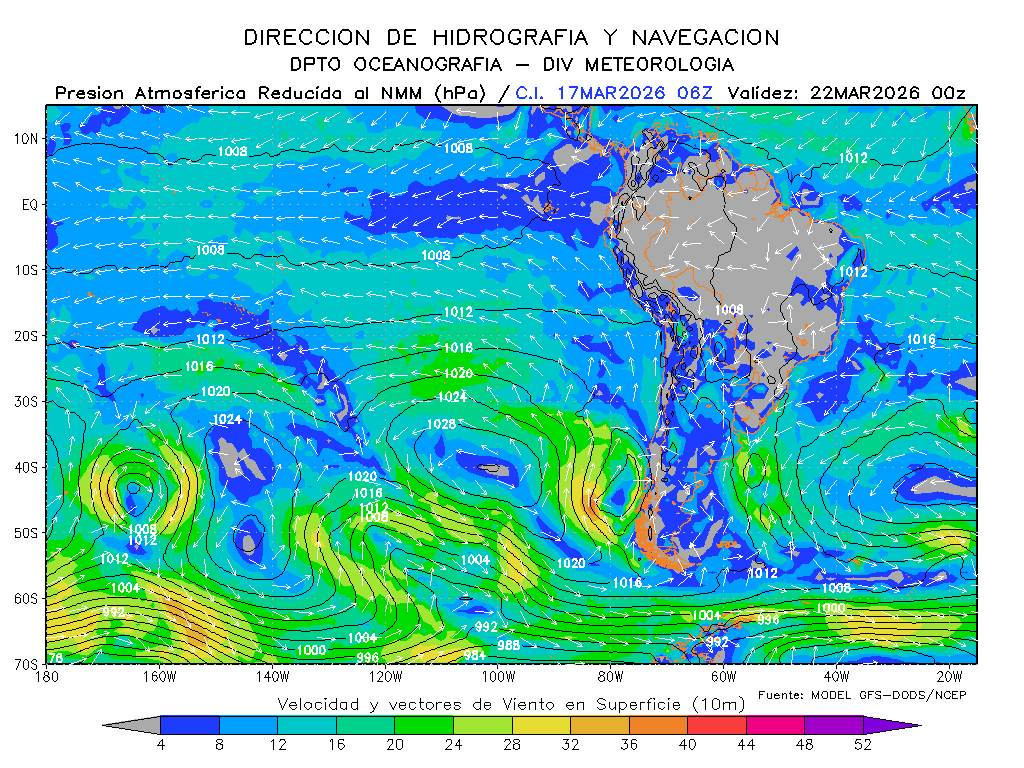 El modelo GFS-DODS/NCEP muestra que los vientos del sureste disminuirían la intensidad de su magnitud frente a la costa sur para los próximos días, se mantendrían frente a la costa norte e incrementaría frente a la centro, presentándose por debajo de lo normal frente a la costa centro de Perú y por debajo de lo normal frente a la norte y sur. El anticiclón del Pacífico sur tendría una composición zonal con un desarrollo con dirección noreste y manteniendo su intensidad, esperándose dentro de su normal y en posición ligeramente al oeste de su normal.