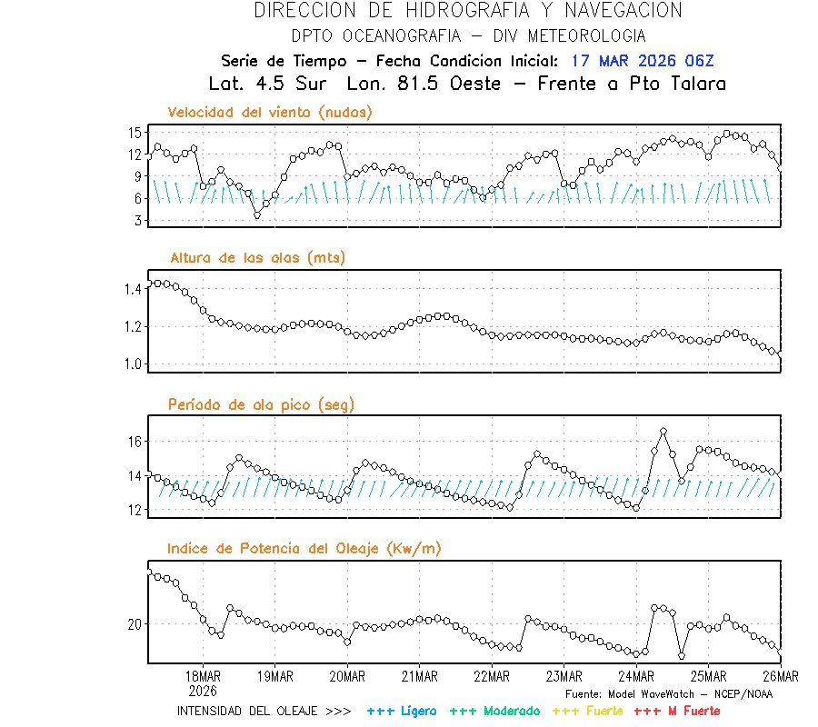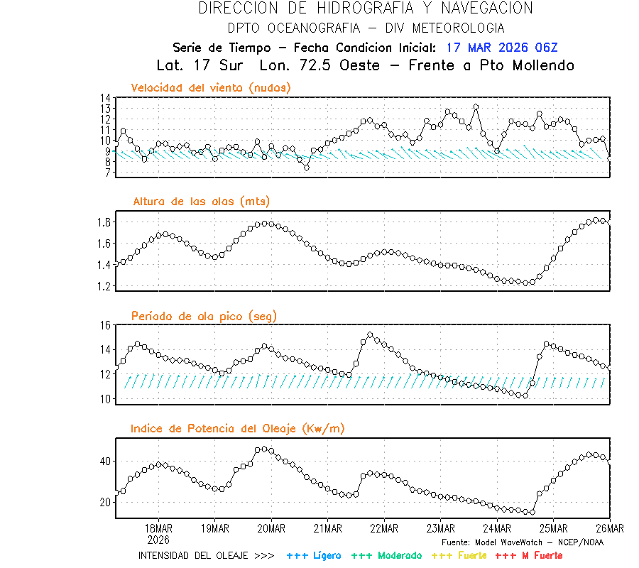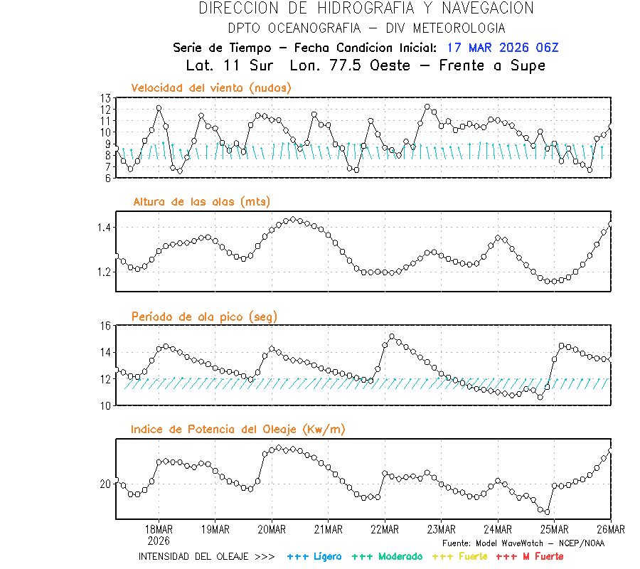 El modelo WWATCH III para el 18 de marzo muestra frente a la costa norte de Perú vientos con magnitudes de 04 a 16 nudos frente a la costa norte, en el centro de 03 a 09 nudos y frente a la costa sur fluctuación de 04 a 06 nudos. El mismo modelo, muestra frente a la costa norte y centro de Perú una tendencia al incremento de la altura de las olas de 0.9 m a 1.2 m; mientras que, frente a la costa sur sería de 1.3 m a 1.6 m, asociado a periodos de 12 s a 16 s.