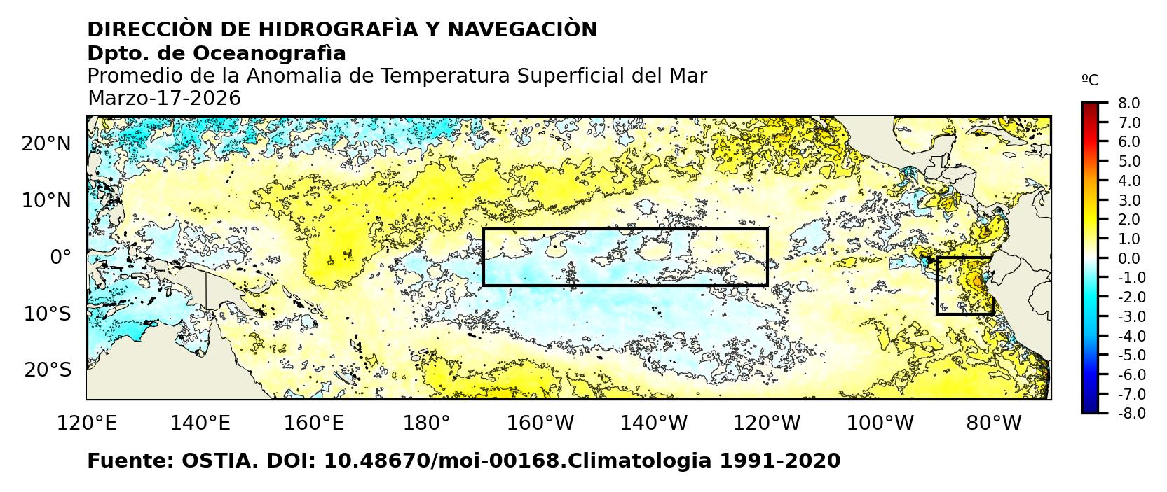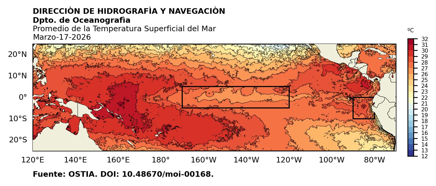 Figura 1. Temperatura superficial del mar (°C) en el océano Pacífico. Los cuadros en azul son regiones Niño. Fuente: Datos: OSTIA; Gráficos: DHN