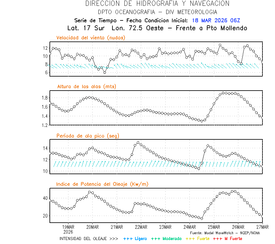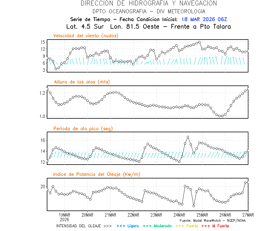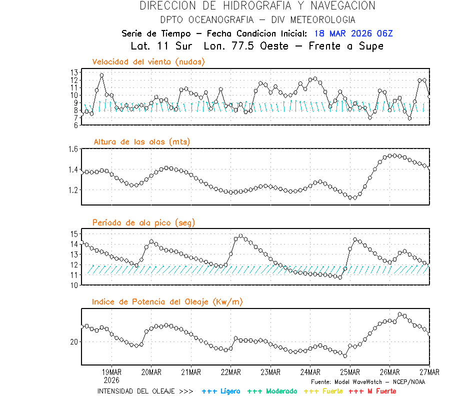 El modelo WWATCH III para el 19 de marzo muestra frente a la costa norte de Perú vientos con magnitudes de 04 a 16 nudos frente a la costa norte, en el centro de 03 a 09 nudos y frente a la costa sur fluctuación de 04 a 06 nudos. El mismo modelo, muestra frente a la costa norte y centro de Perú una tendencia al incremento de la altura de las olas de 0.9 m a 1.2 m; mientras que, frente a la costa sur sería de 1.3 m a 1.6 m, asociado a periodos de 12 s a 16 s.