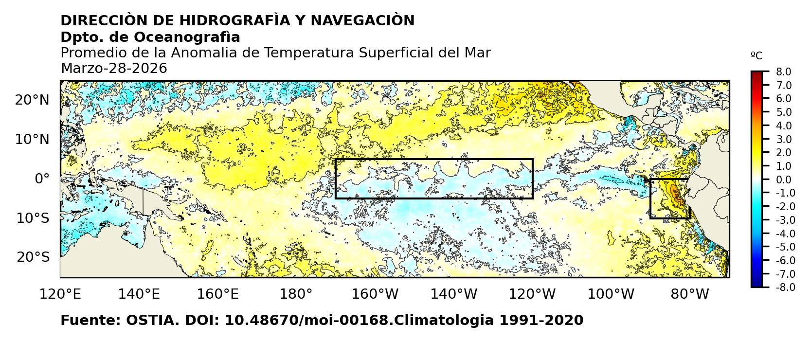 Figura 1. Temperatura superficial del mar (°C) en el océano Pacífico. Los cuadros en azul son regiones Niño. Fuente: Datos: OSTIA; Gráficos: DHN