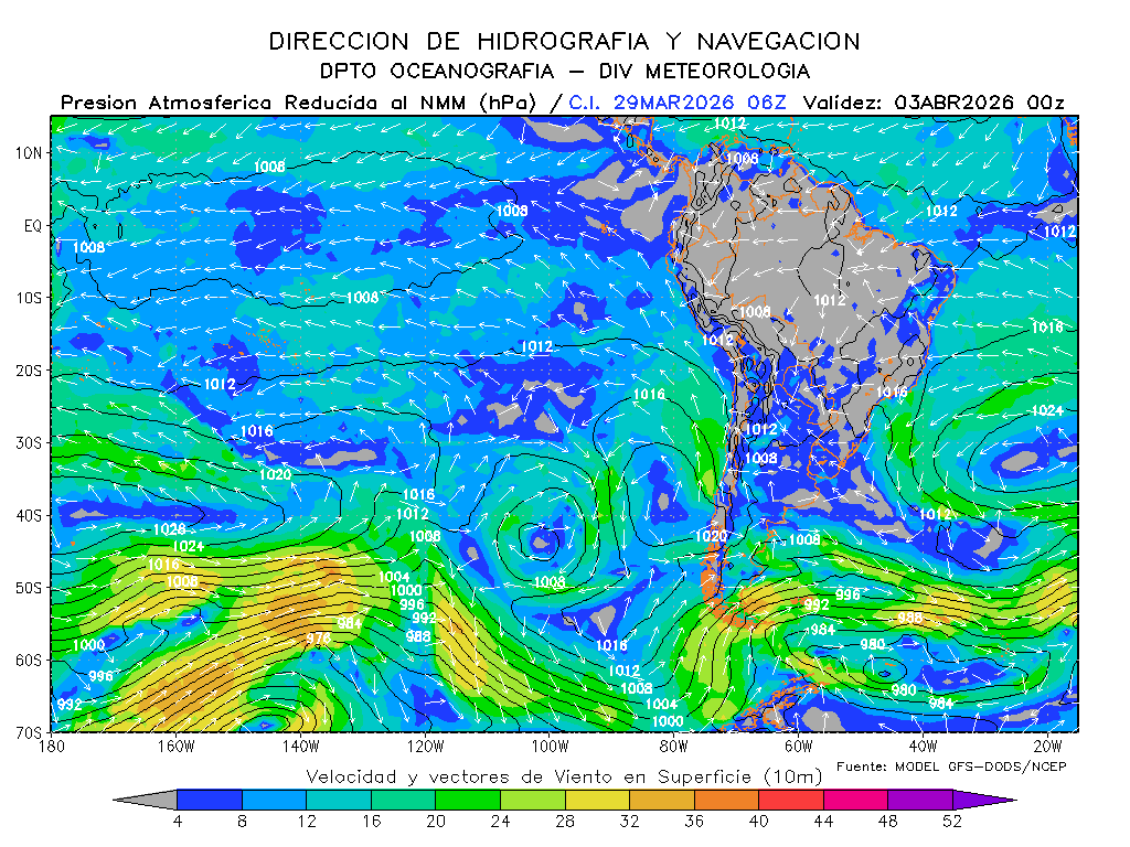 Para el 30 de marzo el sistema de alta presión disminuiría dentro del rango normal con presiones máximas de 1020 hPa y ubicándose al oeste de su posición normal; debido a esto, los vientos del sudeste se presentarían con intensidad de por debajo de lo normal frente a toda la costa de Perú.