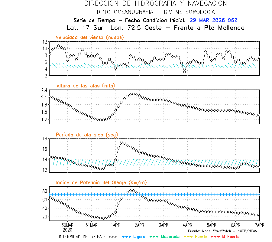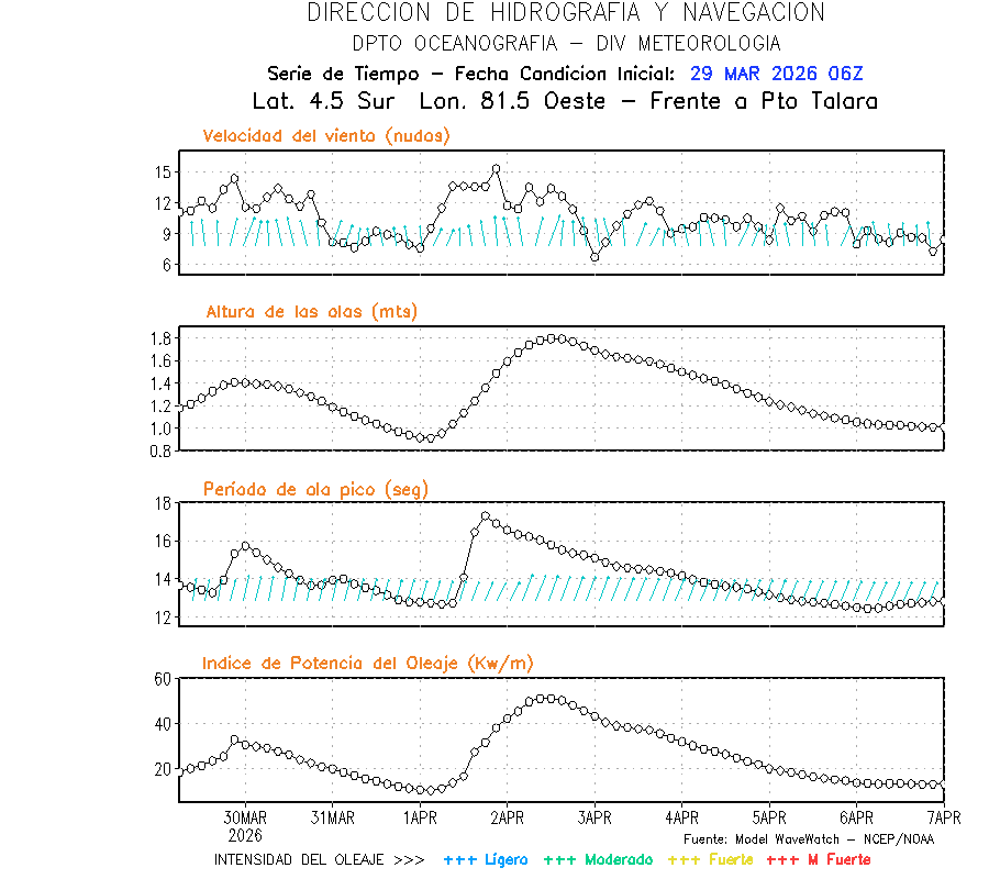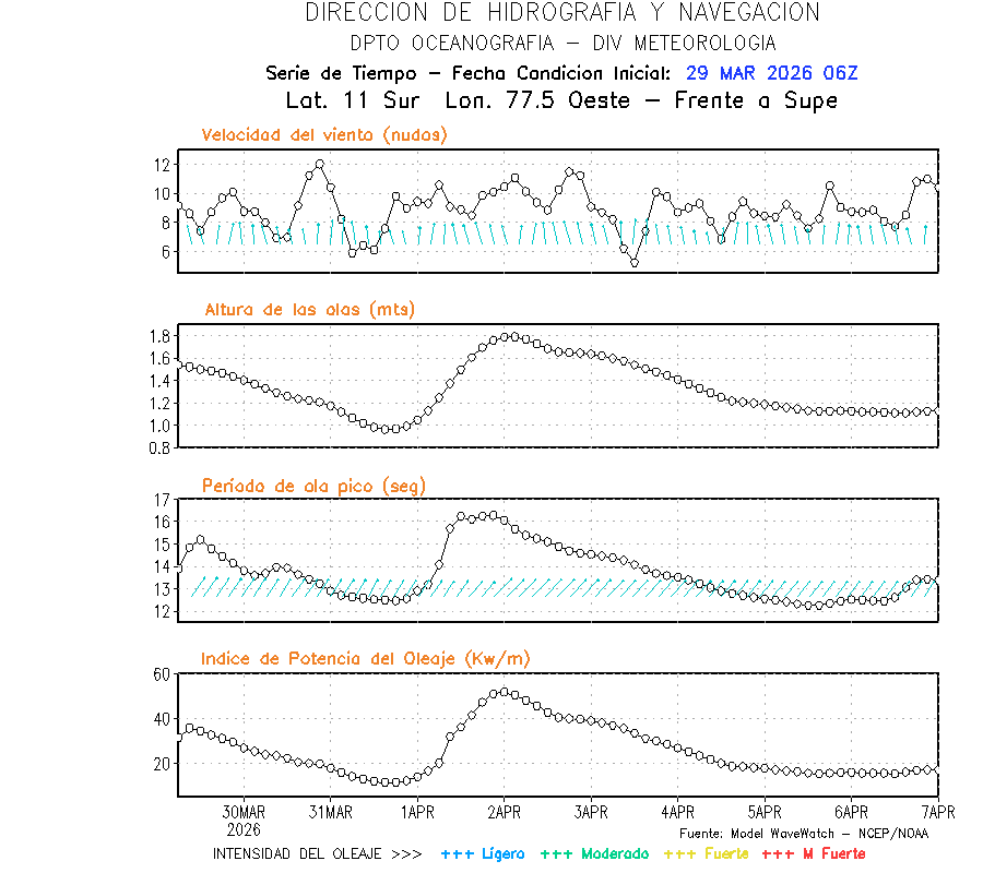 El modelo WWATCH III para el 30 de marzo muestra frente a la costa norte de Perú vientos con magnitudes de 04 a 16 nudos frente a la costa norte, en el centro de 03 a 09 nudos y frente a la costa sur fluctuación de 04 a 06 nudos. El mismo modelo, muestra frente a la costa norte y centro de Perú una tendencia al incremento de la altura de las olas de 0.9 m a 1.2 m; mientras que, frente a la costa sur sería de 1.3 m a 1.6 m, asociado a periodos de 12 s a 16 s.