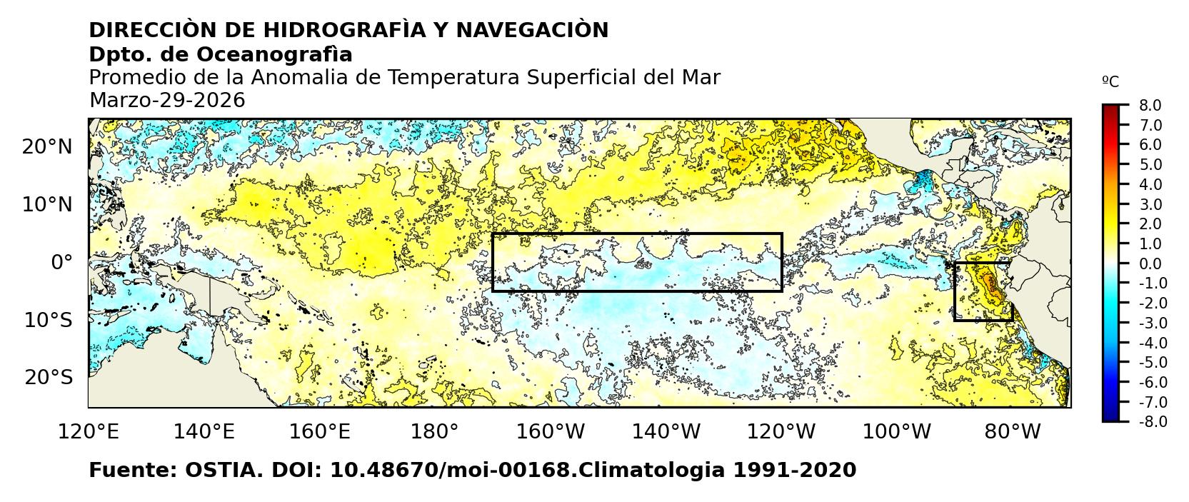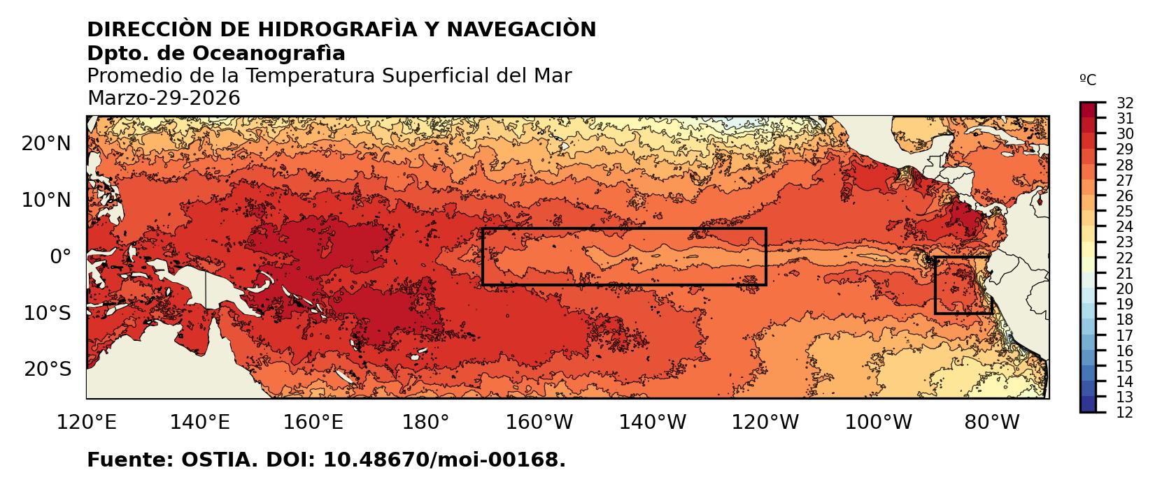 Figura 1. Temperatura superficial del mar (°C) en el océano Pacífico. Los cuadros en azul son regiones Niño. Fuente: Datos: OSTIA; Gráficos: DHN