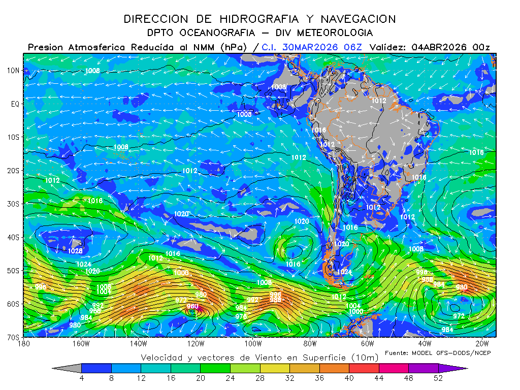 El modelo GFS-DODS/NCEP muestra que los vientos del sureste disminuirían la intensidad de su magnitud frente a la costa sur para los próximos días, se mantendrían frente a la costa norte e incrementaría frente a la centro, presentándose por debajo de lo normal frente a la costa centro de Perú y por debajo de lo normal frente a la norte y sur. El anticiclón del Pacífico sur tendría una composición zonal con un desarrollo con dirección noreste y manteniendo su intensidad, esperándose dentro de su normal y en posición ligeramente al oeste de su normal.