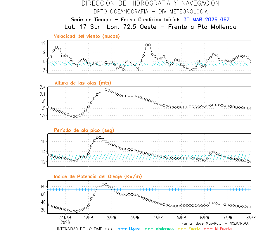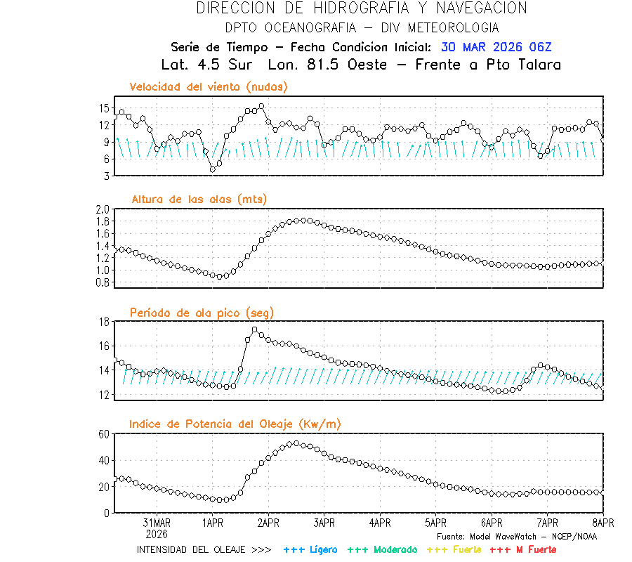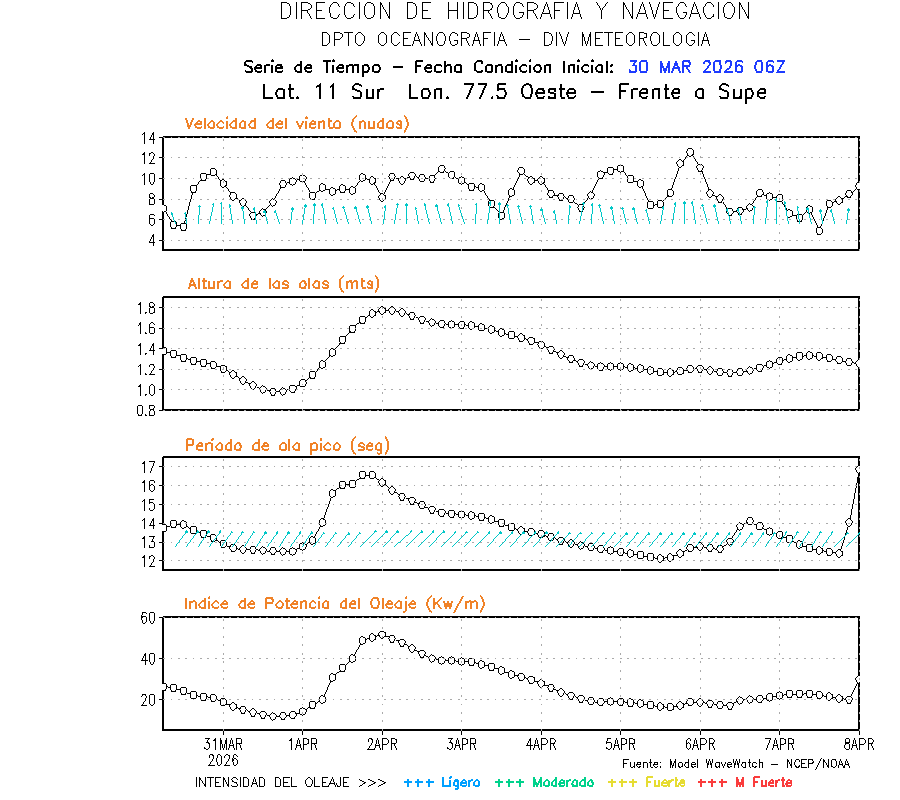 El modelo WWATCH III para el 31 de marzo muestra frente a la costa norte de Perú vientos con magnitudes de 04 a 16 nudos frente a la costa norte, en el centro de 03 a 09 nudos y frente a la costa sur fluctuación de 04 a 06 nudos. El mismo modelo, muestra frente a la costa norte y centro de Perú una tendencia al incremento de la altura de las olas de 0.9 m a 1.2 m; mientras que, frente a la costa sur sería de 1.3 m a 1.6 m, asociado a periodos de 12 s a 16 s.