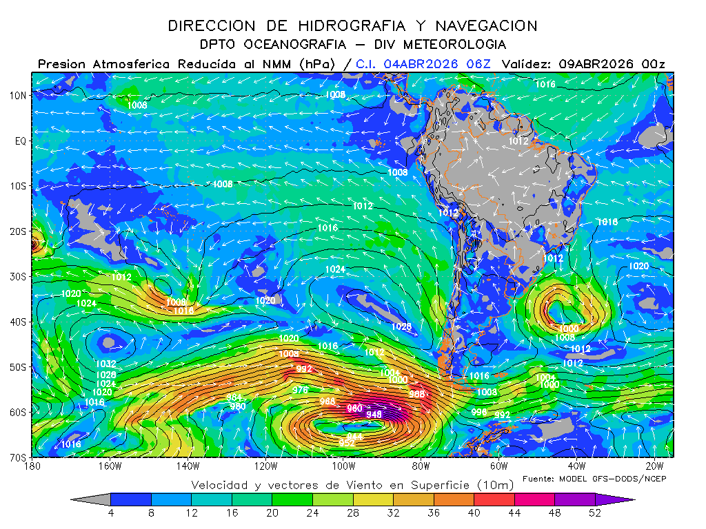 Para el 05 de abril el sistema de alta presión disminuiría dentro del rango normal con presiones máximas de 1020 hPa y ubicándose al oeste de su posición normal; debido a esto, los vientos del sudeste se presentarían con intensidad de por debajo de lo normal frente a toda la costa de Perú.