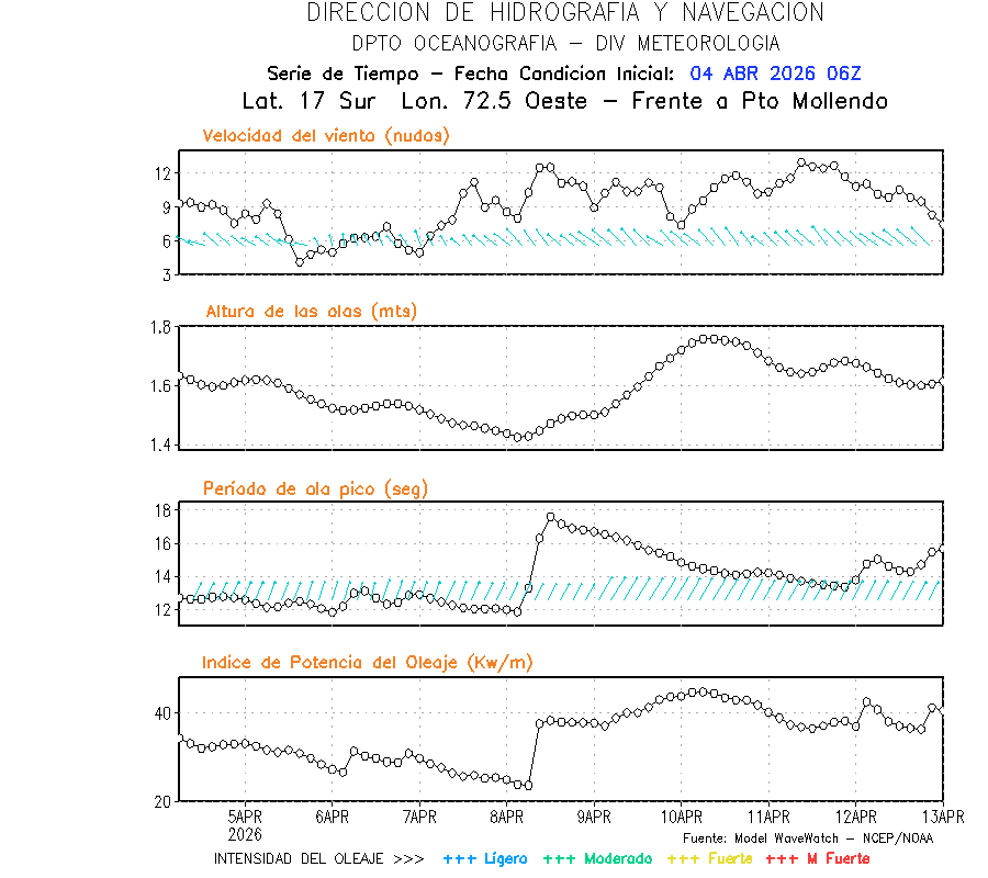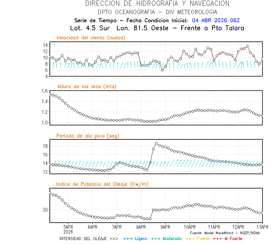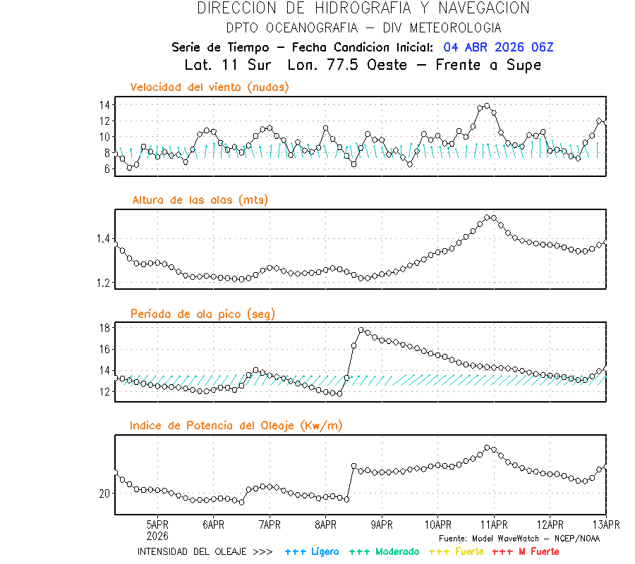 El modelo WWATCH III para el 05 de abril muestra frente a la costa norte de Perú vientos con magnitudes de 04 a 16 nudos frente a la costa norte, en el centro de 03 a 09 nudos y frente a la costa sur fluctuación de 04 a 06 nudos. El mismo modelo, muestra frente a la costa norte y centro de Perú una tendencia al incremento de la altura de las olas de 0.9 m a 1.2 m; mientras que, frente a la costa sur sería de 1.3 m a 1.6 m, asociado a periodos de 12 s a 16 s.